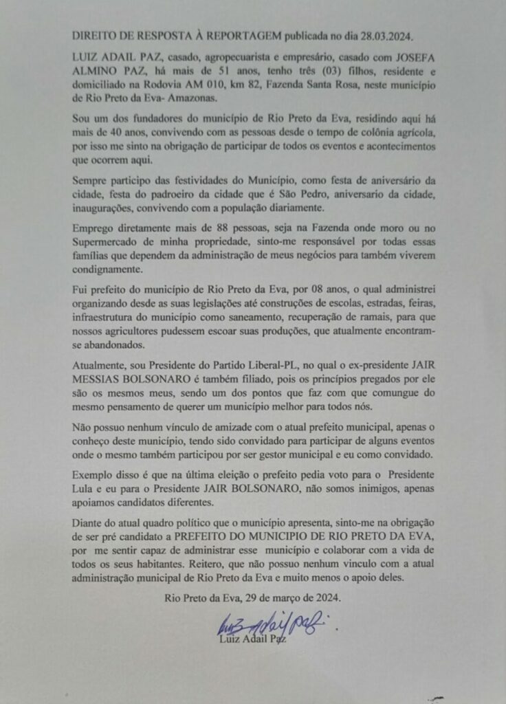 Do outro lado, a população que se via há décadas sem alternativas em Rio Preto da Eva, por conta de um boicote que gerava a falta de visibilidade de candidatos da oposição, agora passa a ter o sentimento de esperança renovada por meio da pré-candidatura de um simples agricultor local. O nome dele: Altermir Barroso. No entanto, o caminho do trabalhador que almeja representar o povo na política não tem sido fácil: o produtor, que iria ser pré-candidato à prefeitura pelo Partido Liberal, acabou tomando uma dura “pernada” após articulação envolvendo o prefeito Anderson Sousa, o ex-prefeito Adail Paz e o presidente do PL Amazonas, Alfredo Nascimento. O que já sinalizaria mais uma grande falta de apoio e derrota para um homem que já disputou três eleições em 2012, 2016 e 2020.
