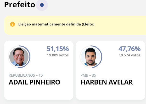 Amazonas – Com 97,53% das urnas apuradas, Adail Pinheiro foi escolhido como o novo prefeito de Coari, conquistando 51,15% dos votos, o que equivale a 19.889 votos. O candidato do Republicanos – 10 superou seu concorrente, Harben Avelar, que ficou em segundo lugar com 47,76% dos votos, totalizando 18.574 votos.