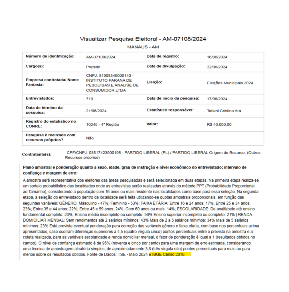 Identificada como AM-07108/2024, a pesquisa foi realizada pela Paraná Pesquisas e teve como base dados do TSE de maio de 2024 e do Censo de 2010 do IBGE. Contratada pelo Partido Liberal (PL) ao custo de R$ 40 mil, a pesquisa foi registrada em 16 de junho deste ano. No entanto, de forma inesperada, a pesquisa, que estava pronta para ser divulgada, não aparece mais nos registros do TSE e não será tornada pública.