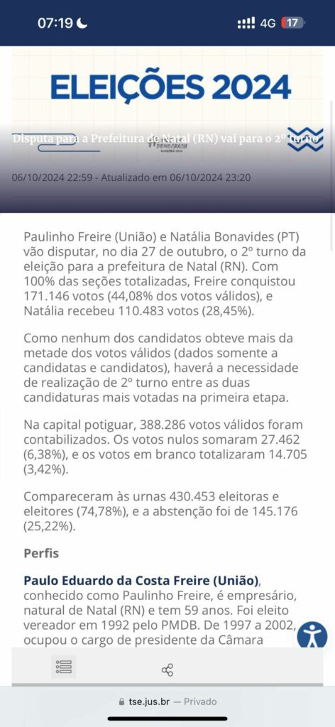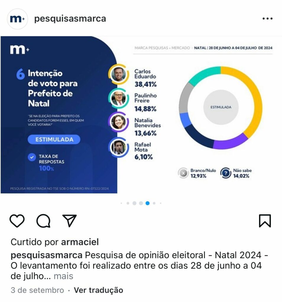 A segunda “pesquisa furada” divulgada foi de Natal (RN) que apontava Carlos Eduardo em primeiro (14,27%), seguido de Paulinho Freire (9,88%) e Natália Benevides (6,22%). Carlos Eduardo sequer foi para o segundo turno que hoje é disputado por Paulinho e Natália.