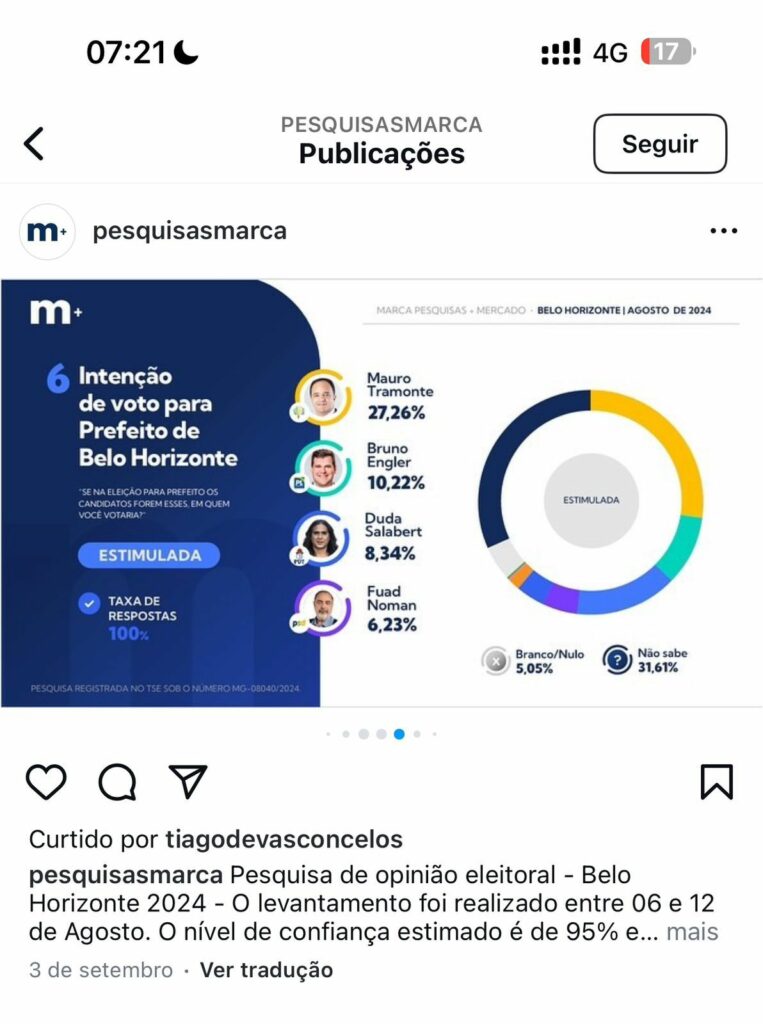 A terceira “pesquisa furada” da Marca foi em Belo Horizonte (MG) que apontava Mauro Tramonte em primeiro com 27,26%, Bruno Engler com 10,22% e Duda Salabert com 8,34%. Engler e Fuad Nomam são quem disputam o segundo turno.
