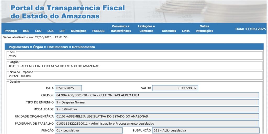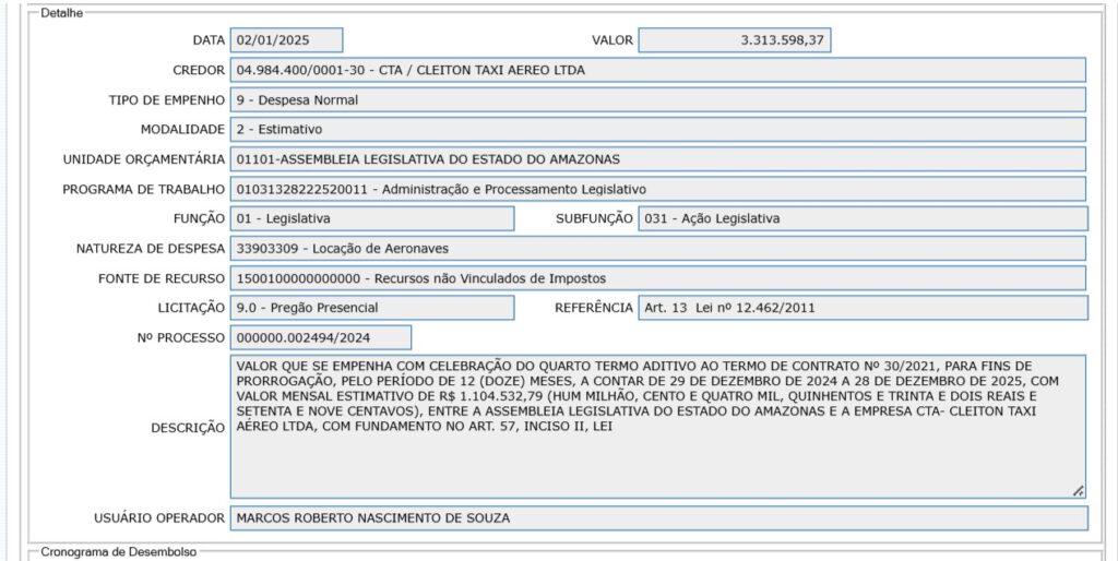 Outro ponto que chama atenção é a concentração do contrato em uma única empresa: a CTA – Cleiton Táxi Aéreo Ltda. A relação contratual entre a Aleam e a empresa já dura, ao menos, desde 2021. Não há informações públicas claras sobre concorrência ou abertura de novas licitações para prestação do serviço, o que pode indicar falta de competitividade no processo e uma possível zona de conforto administrativa.