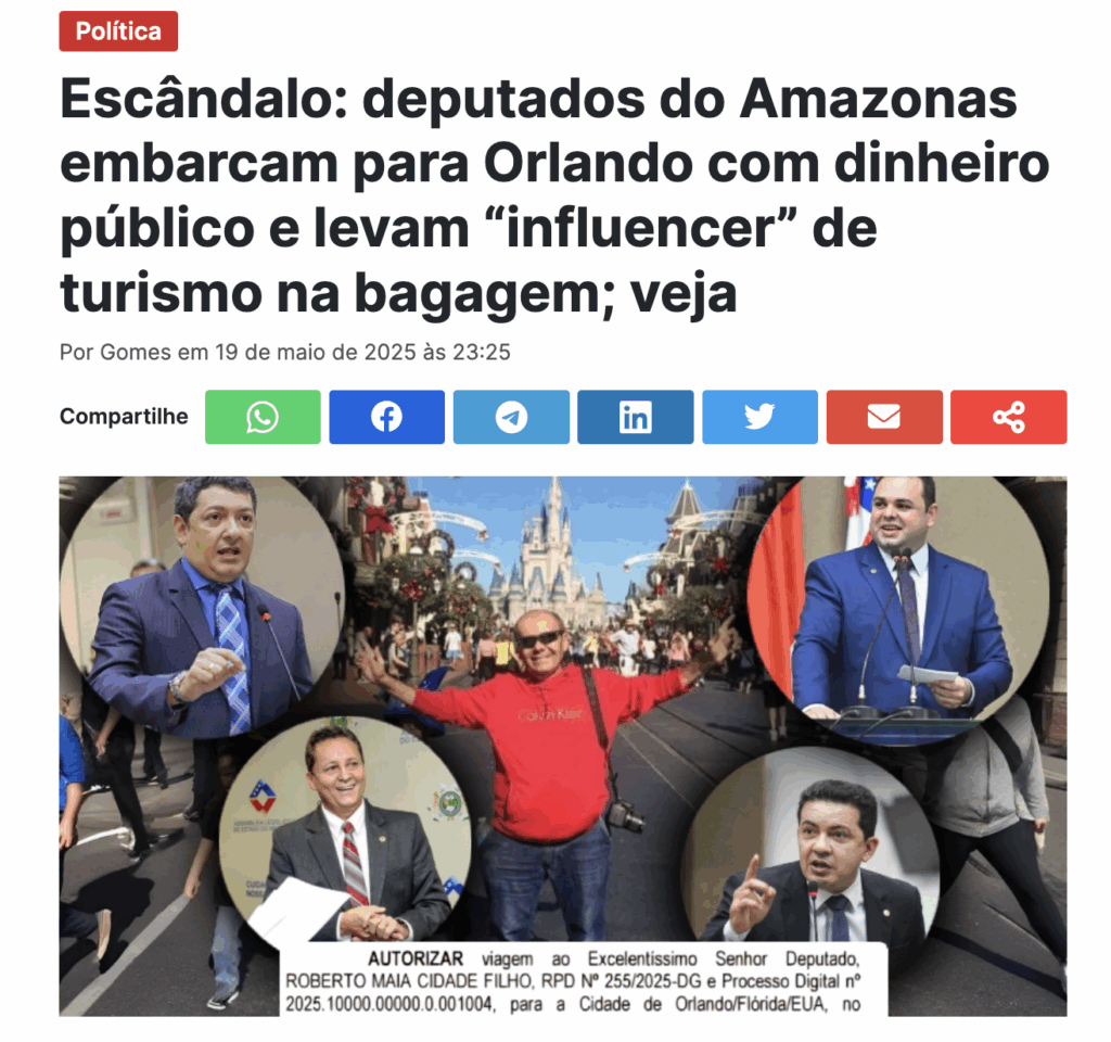 Amazonas – Um escândalo envolvendo deputados da Assembleia Legislativa do Amazonas (ALEAM) tem agitado os bastidores da política amazonense desde a denúncia publicada pelo portal CM7 Brasil na última segunda-feira (19). A revelação de que parlamentares, incluindo o presidente da ALEAM, Roberto Cidade, viajaram para Orlando, na Flórida, com despesas custeadas pelo dinheiro público, levantou questionamentos sobre a transparência e a legitimidade dessas movimentações. Até o momento, a Casa Legislativa permanece em silêncio, enquanto a população cobra explicações.