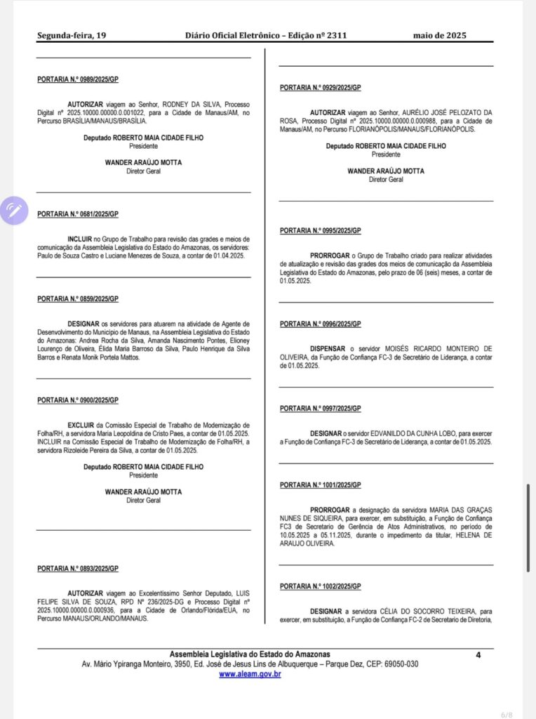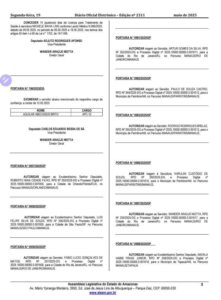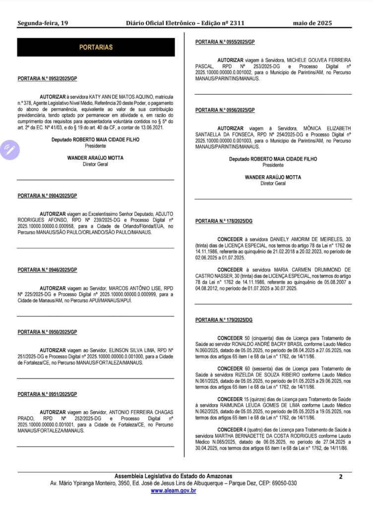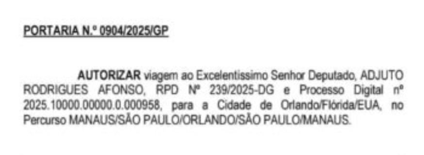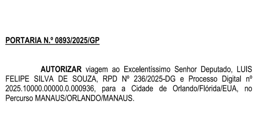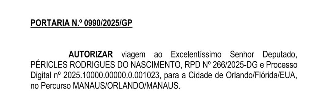 Apesar da omissão, documentos públicos já confirmam a viagem dos parlamentares Roberto Cidade, Adjuto Afonso, Felipe Souza e Péricles Nascimento — todos ausentes em algumas sessões da ALEAM. Coincidência ou não, a recente aprovação da redução de três para duas sessões semanais na Casa Legislativa agora parece ter outra motivação.