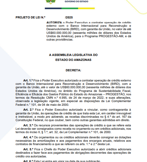 Amazonas – A Assembleia Legislativa do Amazonas (Aleam) aprovou, nesta quinta-feira (11/12), a autorização para que o Governo do Estado contrate um novo empréstimo internacional de até 60 milhões de dólares — cerca de 327 milhões de reais — junto ao Banco Internacional para Reconstrução e Desenvolvimento (Bird). A condução da matéria no plenário teve protagonismo direto da base governista, liderada pela deputada Alessandra Campelo e pelo presidente da Casa, Roberto Cidade, ambos aliados do governador Wilson Lima.