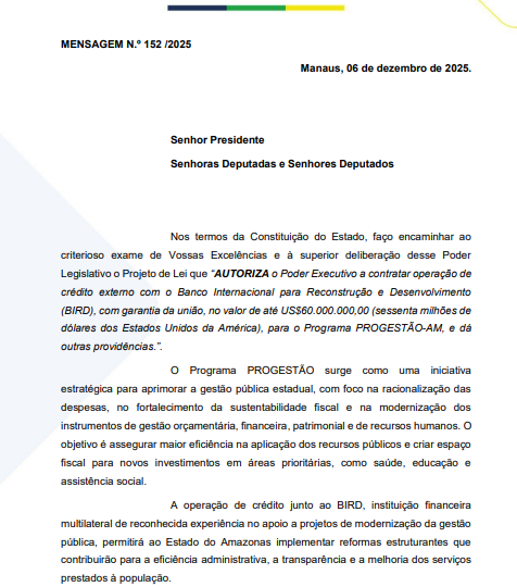 A justificativa enviada pelo Executivo não detalha investimentos, obras ou políticas públicas específicas. O documento limita-se a afirmar que os recursos integram o programa Progestão, voltado ao aprimoramento da administração estadual, com objetivos genéricos como racionalização de despesas, sustentabilidade fiscal e modernização de processos orçamentários, financeiros, patrimoniais e de recursos humanos.