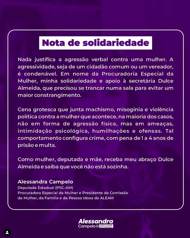 Em notas nas suas redes sociais divulgadas na noite de quarta-feira (27), Alessandra Campelo diz o seguinte: “Nada justifica a agressão verbal contra uma mulher. A agressividade, seja de um cidadão comum ou um vereador, é condenável. Em nome da Procuradoria Especial da Mulher, minha solidariedade e apoio à secretária Dulce Almeida (@dulcealmeida), que precisou se trancar numa sala para evitar um maior constrangimento”, explanou a deputada.