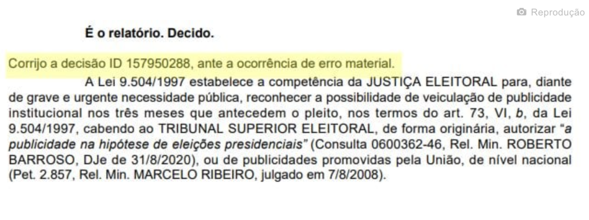 Mesmo com o novo posicionamento, trecho da decisão frisa que a campanha de “Divulgação do Bicentenário da Independência” deve afastar do material publicitário a “alusão a sítio da internet contendo, mesmo de forma abreviada, menção ao ‘governo’; a reprodução do trecho que excede à informação da população acerca do Bicentenário da Independência, com eventual conotação eleitoral, consistente em: ‘…E essa luta também levamos para o nosso cotidiano, para a proteção das nossas famílias e sobretudo, para a construção de um Brasil melhor a cada dia….’., em evidente prestígio à paridade de armas”.