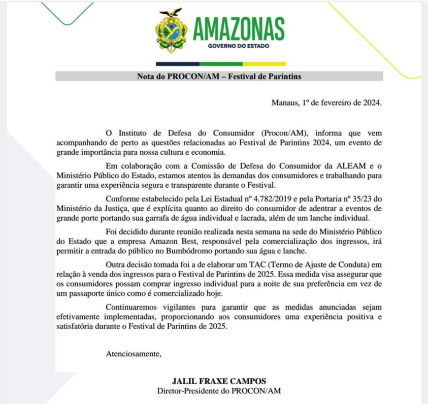 Amazonas – A polêmica envolvendo a desorganização na comercialização de ingressos para o Festival Folclórico de Parintins 2024 resultou em uma diligência conjunta do Instituto de Defesa do Consumidor (Procon/AM) e Ministério Público do Estado do Amazonas (MPAM), culminando na elaboração de um Termo de Ajustamento de Conduta (TAC) em parceria com a empresa responsável pela venda de ingressos, a Amazon Best.