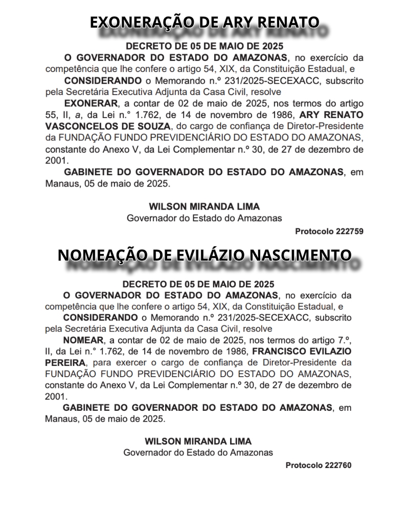 Vale ressaltar que as aplicações de R$300 milhões da AmazonPrev em bancos digitais – sendo de R$250 milhões no C6 Bank e R$50 milhões no Master- foram feitas de forma inconstitucional, entre junho e setembro de 2024, enquanto o cargo de diretor-presidente era ocupado por Ary Renato Vasconcelos de Souza, que foi substituído em 2025 por Evilázio Nascimento, por decisão direta do governador do Estado, Wilson Lima. Ou seja: Ary saiu de cena após a aplicação feita de forma inconstitucional nos bancos. A substituição inclusive ocorreu por ato administrativo, sem processo eletivo interno, o que levanta ainda mais suspeitas acerca do caso.