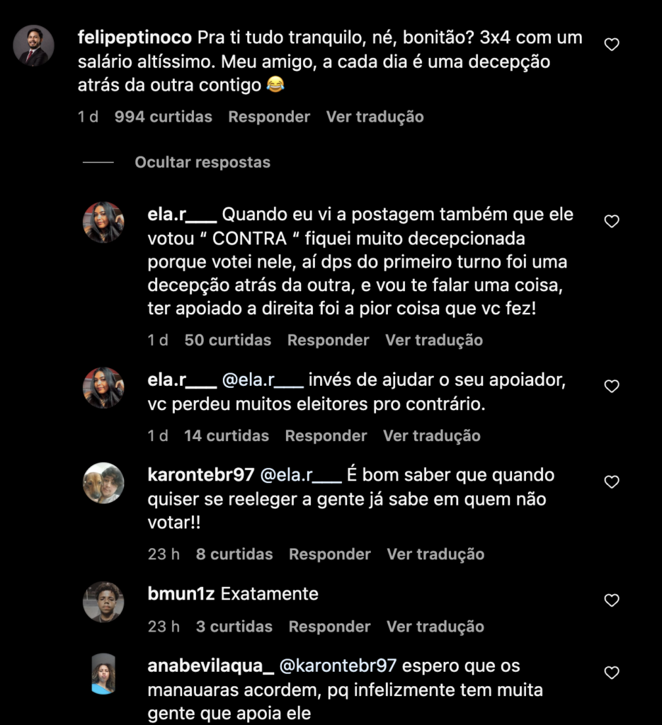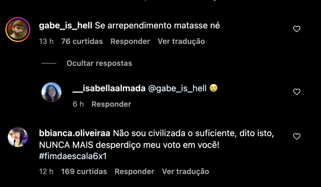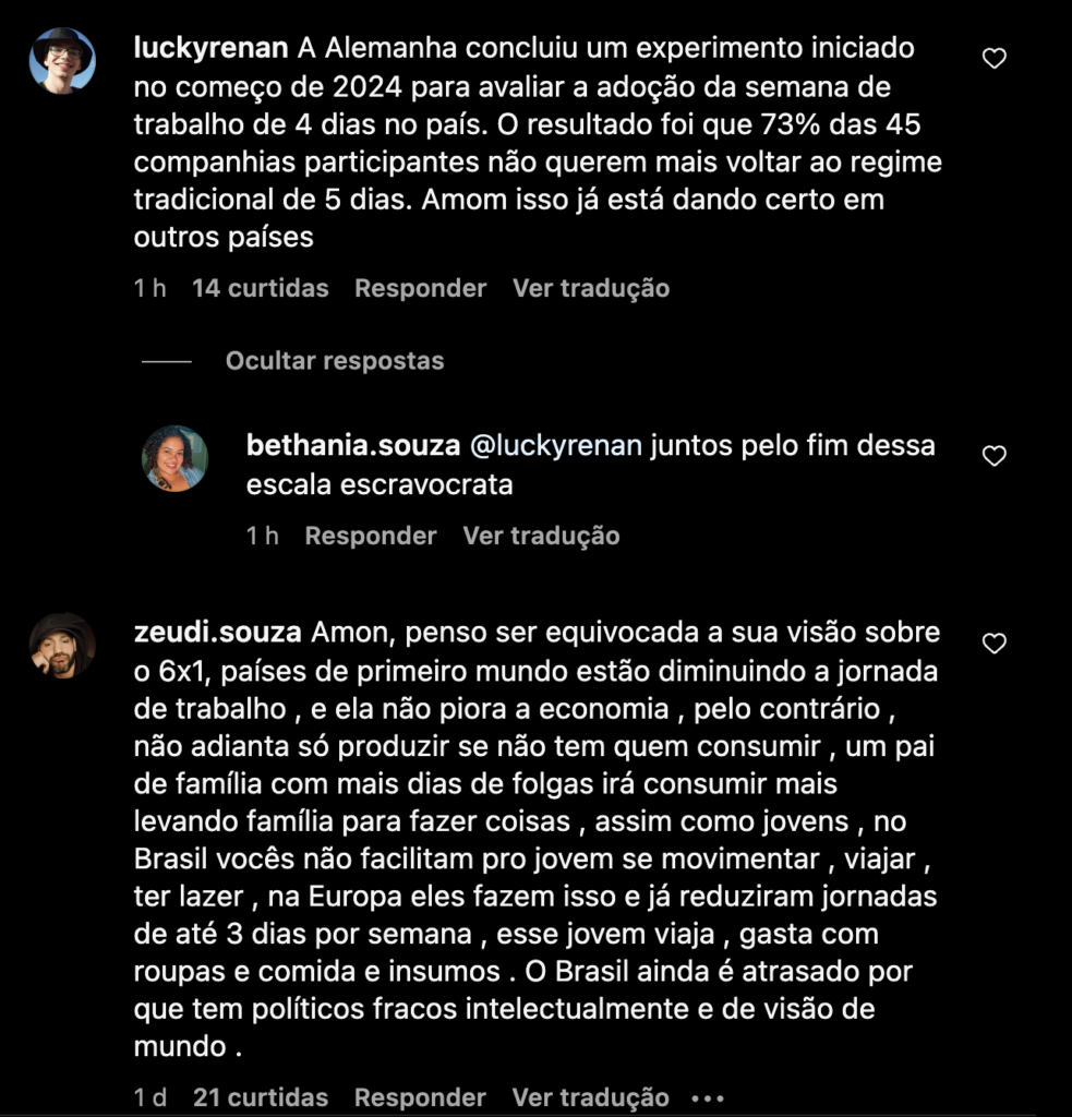 A reação de seus seguidores foi imediata. Muitos eleitores expressaram desaprovação, considerando que a posição de Mandel contradiz expectativas de melhorias nas condições de trabalho dos brasileiros. Diversos comentários pediram mais sensibilidade às dificuldades enfrentadas pelos trabalhadores que lidam com jornadas exaustivas e limitadas folgas.