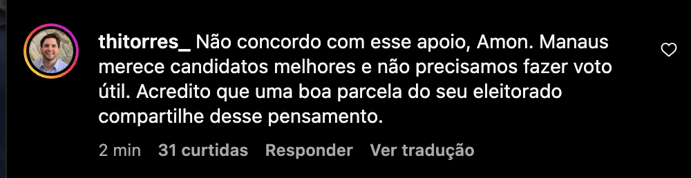 Entretanto, para muitos, essa explicação não foi suficiente. “Ser contra o David Almeida é uma coisa, mas apoiar alguém que representa o retrocesso bolsonarista é outra completamente diferente. O Amom poderia simplesmente ter ficado neutro”, escreveu uma usuária nas redes sociais do deputado.