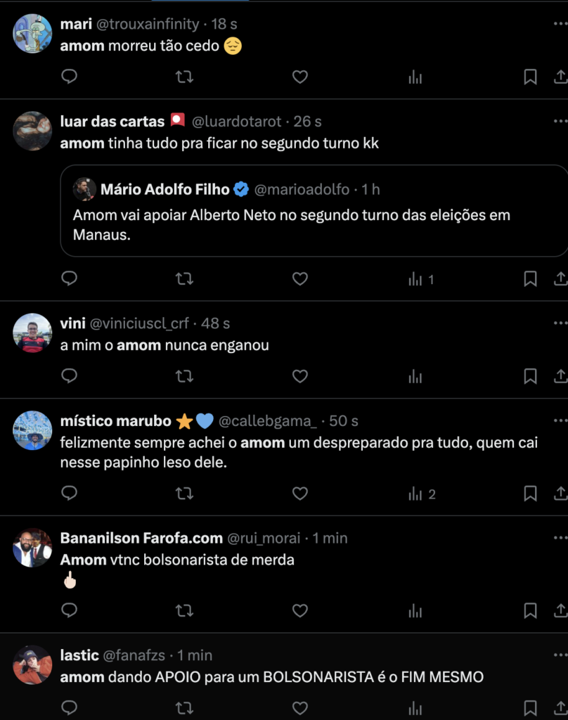“Amom perdeu completamente a noção. Era melhor ter ficado neutro do que apoiar alguém como Alberto Neto. Isso é uma verdadeira decepção”, comentou um eleitor nas redes. Outros foram mais longe, dizendo que, diante dessa postura, irão votar em David Almeida, apenas para evitar que Alberto Neto se torne prefeito de Manaus. “Não concordo com o David, mas votar no Alberto Neto é votar no bolsonarismo. Não podemos permitir isso”, declarou um seguidor de Amom.