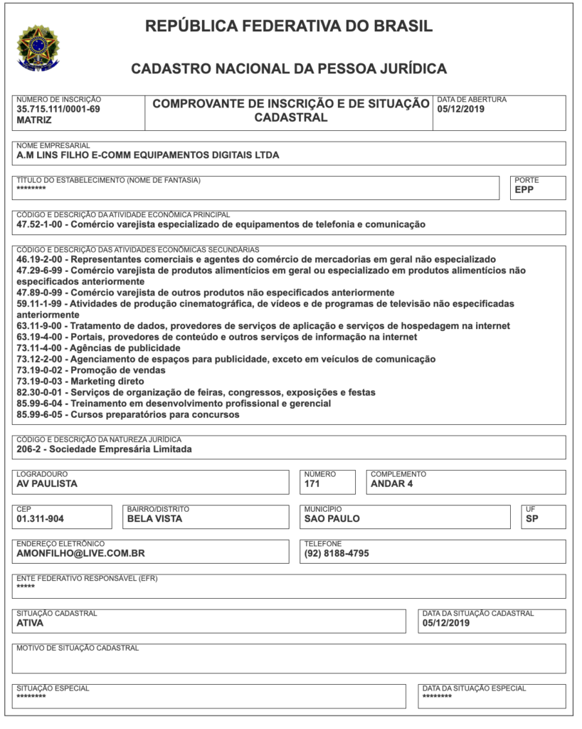 Com um capital social declarado de R$ 10 mil, a empresa possui uma gama diversificada de atividades, desde o comércio de alimentos e equipamentos de telefonia e comunicação até a produção de vídeos e programas de televisão, além do fornecimento de serviços de hospedagem na internet e publicidade, entre outros.