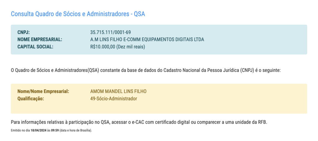 Amom Mandel Lins Filho, que se declara um defensor de Manaus, é sócio de uma empresa registrada em São Paulo. A A.M Lins Filho e-Com Equipamentos Digitais LTDA foi estabelecida em 2019 e tem sede no número 171 da Avenida Paulista, um endereço nobre e um dos locais mais valorizados do Brasil.