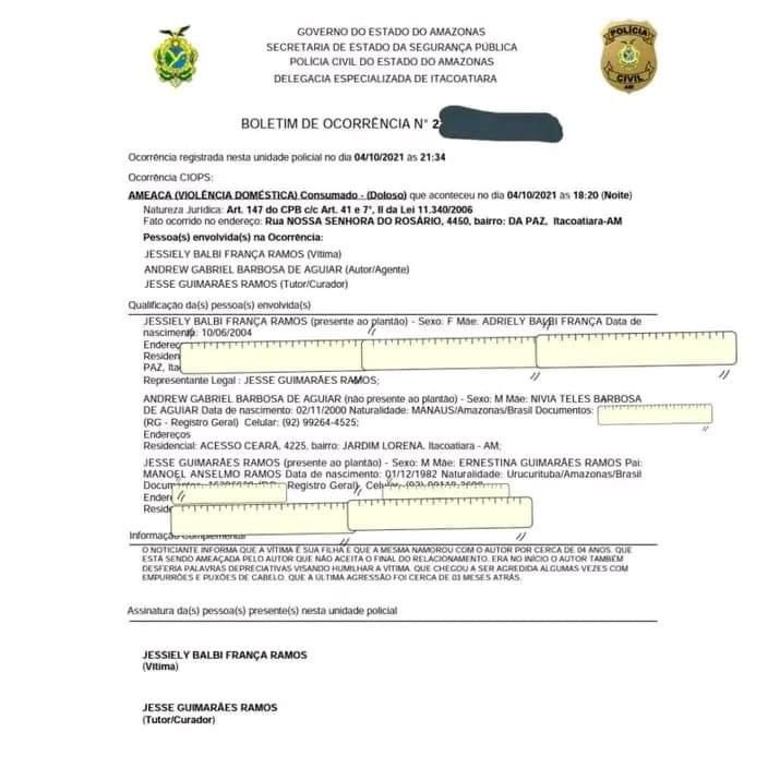 As polêmicas envolvendo Andrew Gabriel Aguiar não param por ai. O jovem também foi acusado de ter agredido a própria esposa, Jessiely Ramos. Quem realizou o boletim de ocorrência foi a mãe da jovem. O caso aconteceu no dia 04/10/2021. E foi registrado como “Ameaça (Violência Domestica) consumado, doloso. Natureza Jurídica: Art. 147 do CP8 c/c Art. 41 e 7″, II da Lei 11.340/2006”.