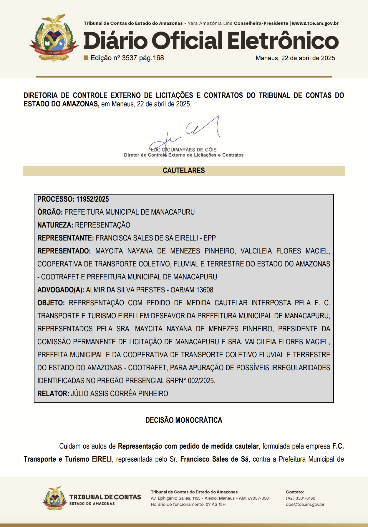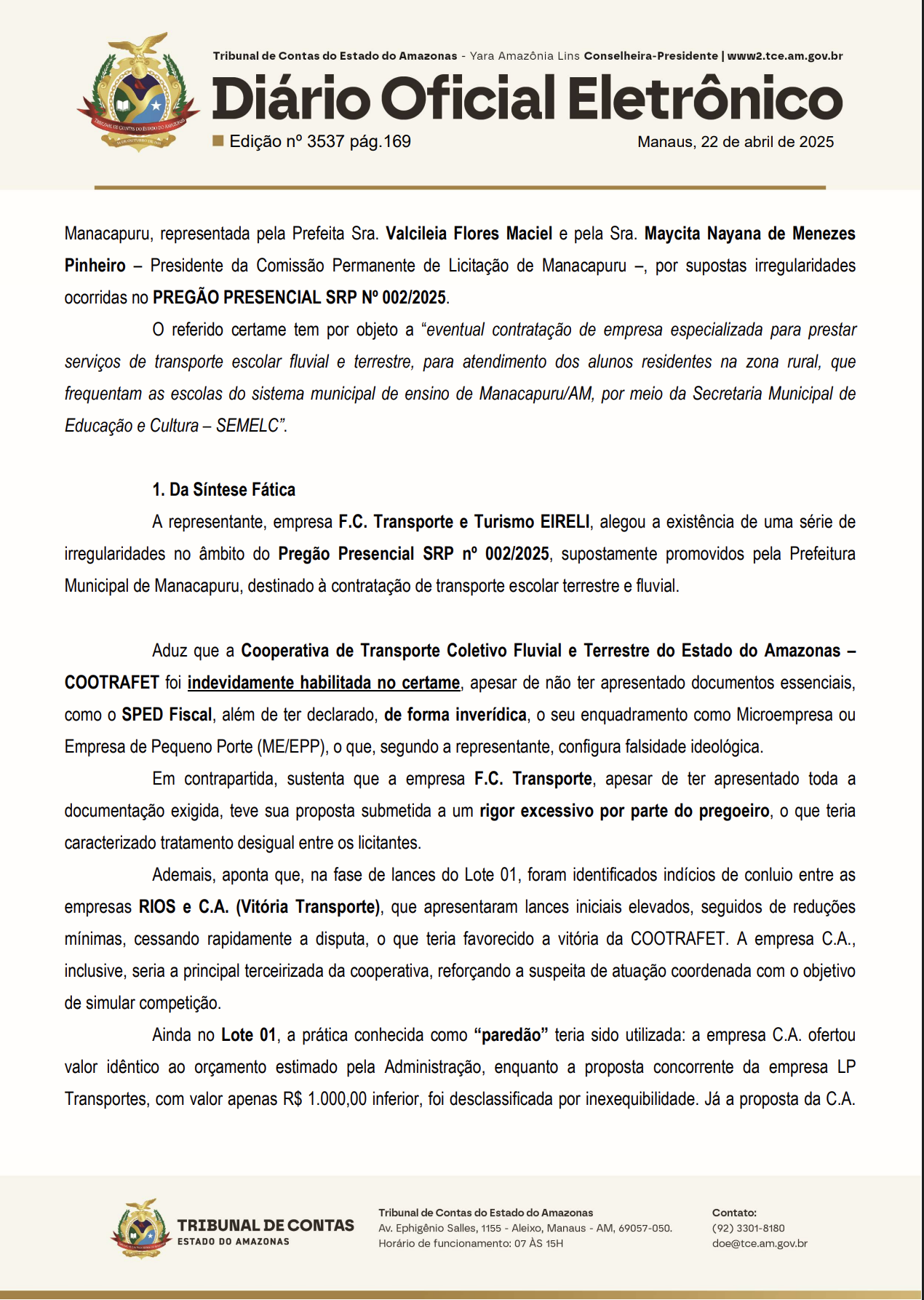 Manaus – Uma denúncia publicada pelo Portal e TV CM7 Brasil no dia 28 de março, sob o título “Escândalo em Manacapuru: Cooperativa COOTRAFET acusada de envolvimento em fraude de licitações milionárias está de volta“, desencadeou uma investigação do Tribunal de Contas do Estado do Amazonas (TCE-AM). A denúncia levou à análise de uma representação com pedido de medida cautelar, apresentada pela empresa F.C. Transporte e Turismo EIRELI contra a Prefeitura de Manacapuru, que resultou em uma notificação à prefeita Valcicleia Flores Maciel e à presidente da Comissão Permanente de Licitação, Maycita Nayana de Menezes Pinheiro, exigindo esclarecimentos sobre irregularidades no Pregão Presencial SRP nº 002/2025, voltado à contratação de transporte escolar fluvial e terrestre.