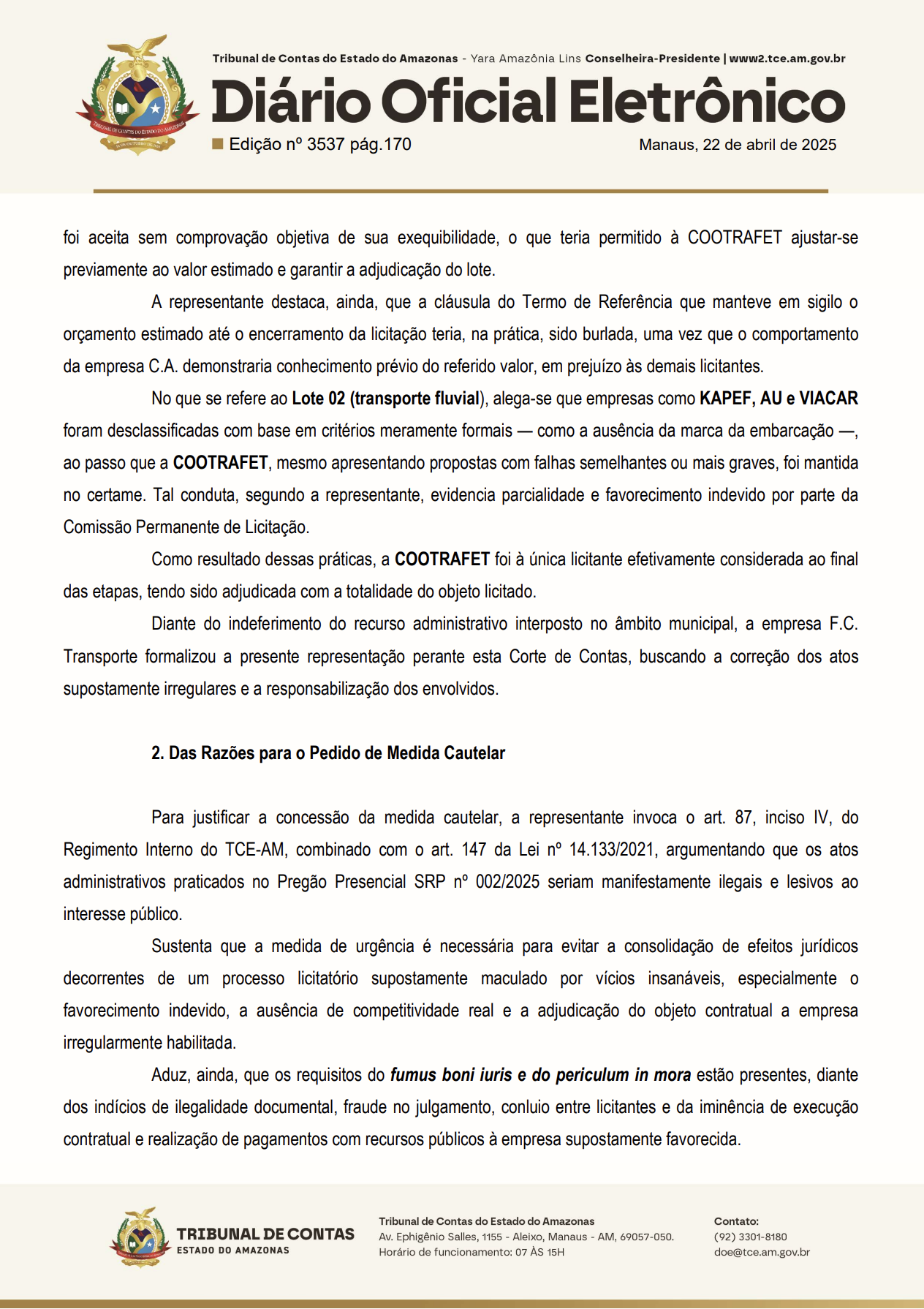 No lote 2, de transporte fluvial, empresas como KAPEF e AU foram desclassificadas por falhas formais, enquanto a COOTRAFET, com falhas semelhantes, foi mantida, sugerindo parcialidade. Como resultado, a COOTRAFET foi a única licitante considerada, adjudicando todo o objeto da licitação. O valor global que a empresa está recebendo da Prefeitura de Manacapuru não foi divulgado, mas nos bastidores circula a informação que o contrato ultrapassa facilmente seis zeros.
