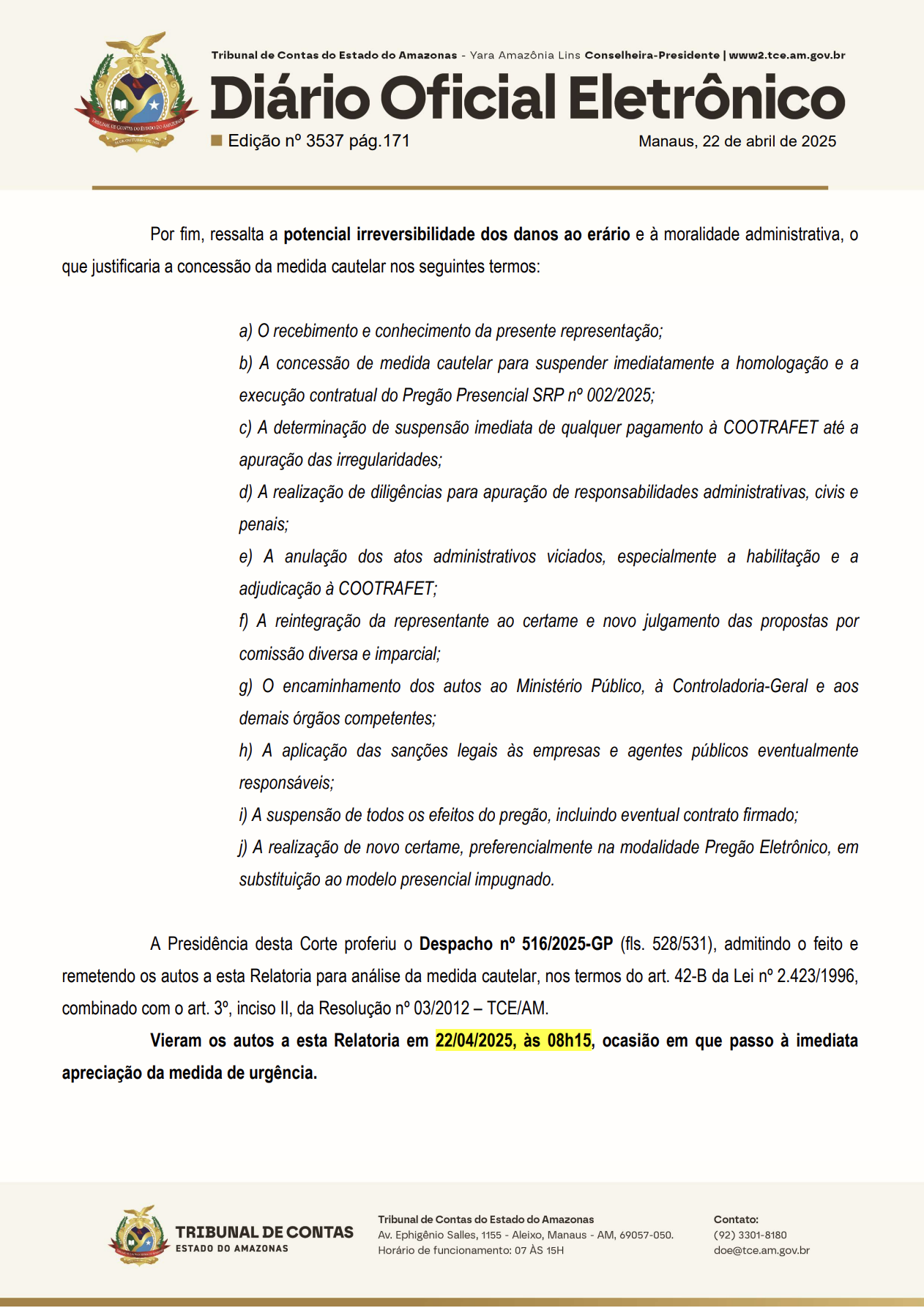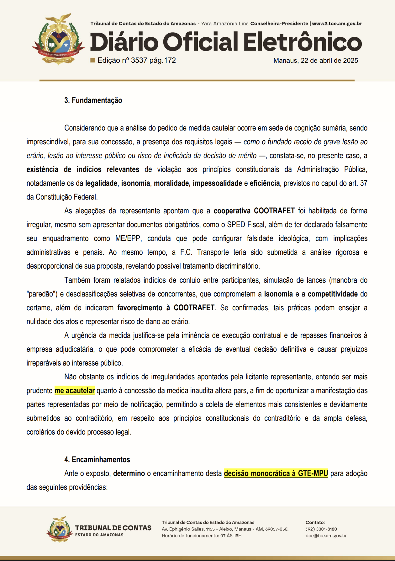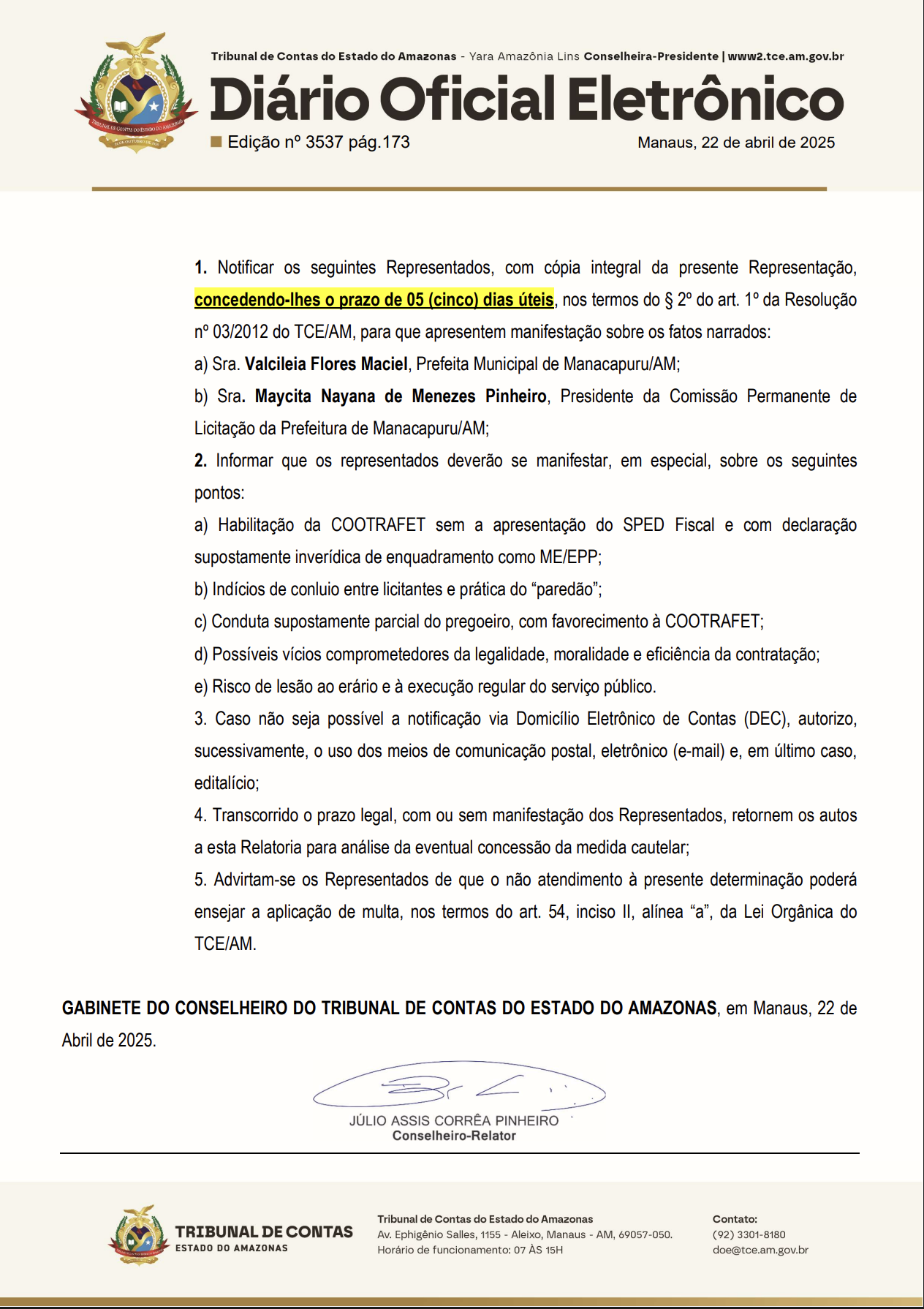 A notificação, publicada no Diário Oficial Eletrônico do TCE-AM em 22 de abril de 2025, dá um prazo de cinco dias úteis para que a Prefeita e a Presidente da Comissão de Licitação se manifestem. O documento aponta que a COOTRAFET foi indevidamente habilitada, apesar de não apresentar o SPED Fiscal e de declarar falsamente seu enquadramento como microempresa ou empresa de pequeno porte (ME/EPP), o que pode configurar falsidade ideológica.