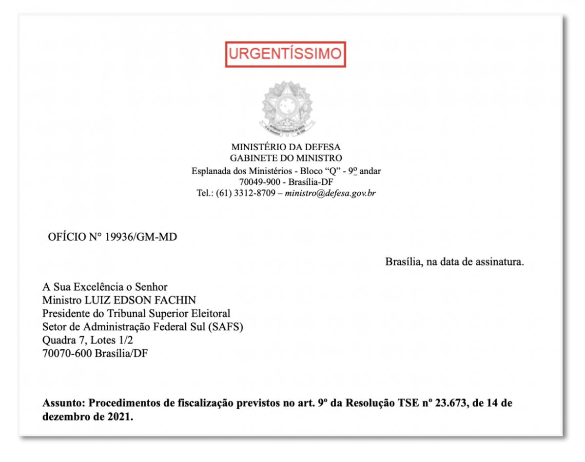 Ainda no ofício, o Ministério da Defesa pediu que o presidente do tribunal, Edson Fachin, disponibilize as informações técnicas entre os dias 2 e 12 de agosto, tendo em vista o curto espaço de tempo até as eleições. Em um outro documento encaminhado ao TSE nesta segunda, Nogueira também cobra “informações técnicas preparatórias” solicitadas pelo Ministério em junho por meio de dois outros ofícios.