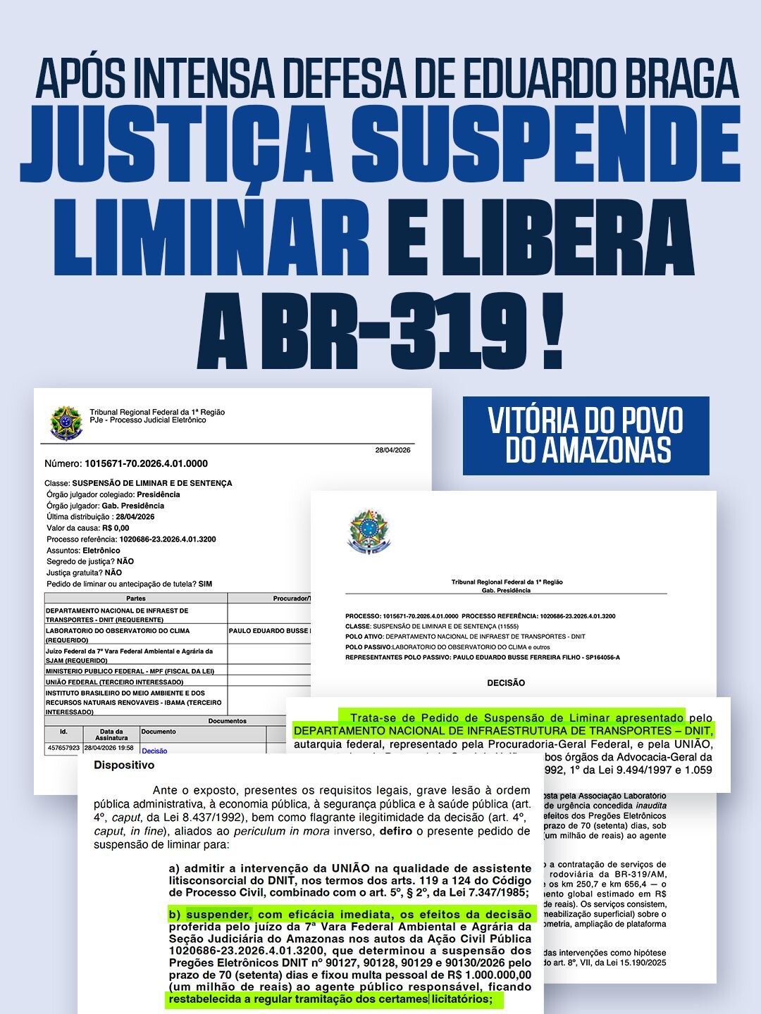 Para Braga, a decisão representa o reconhecimento da urgência e da relevância da rodovia para o Amazonas e para o Brasil. O senador tem defendido que a BR-319 é fundamental para reduzir o isolamento da população, garantir acesso a serviços básicos e fortalecer a economia regional e nacional.