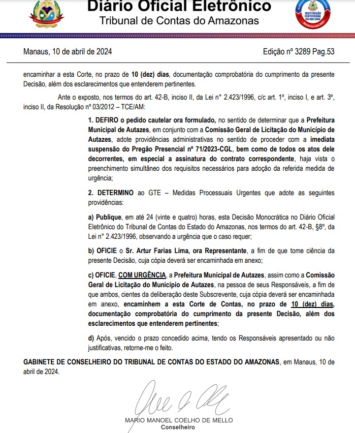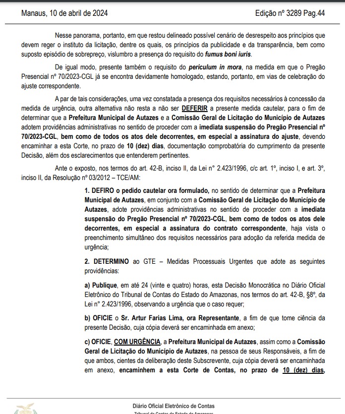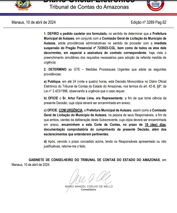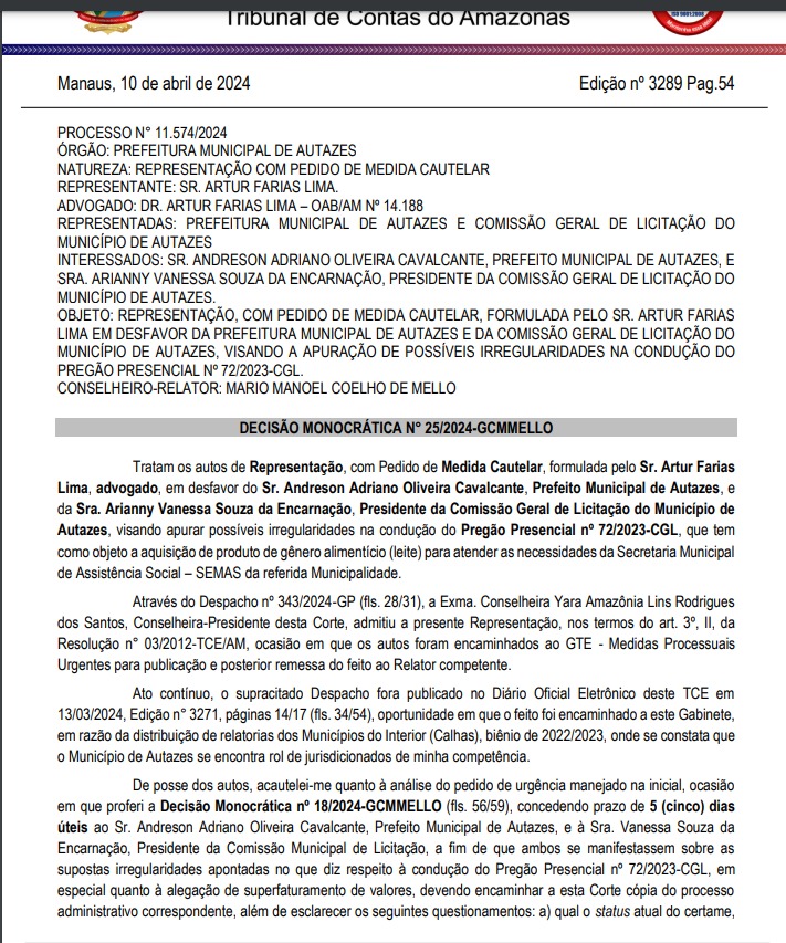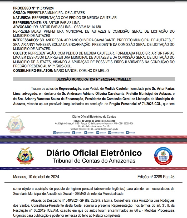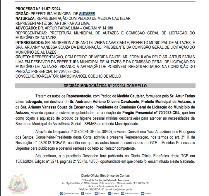 As suspensões foram determinadas através de Representações apresentadas por Artur Farias Lima, que questionam a conduta do prefeito Andreson Cavalcante e da presidente da Comissão Geral de Licitação de Autazes, Arianny Vanessa Souza da Encarnação.