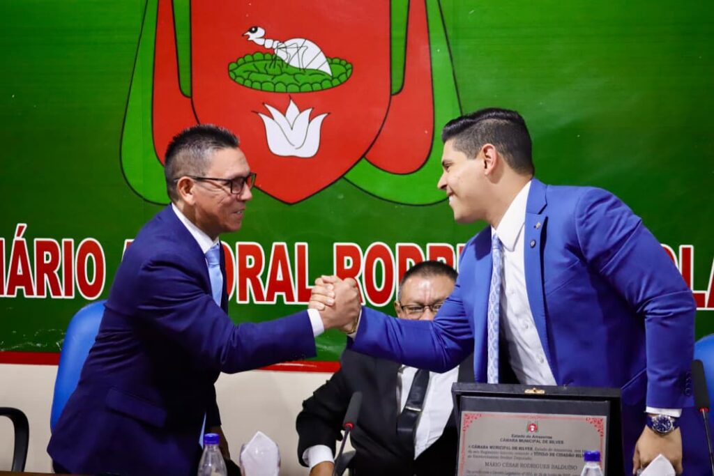 Amazonas – O deputado estadual Mário César Filho (UB) recebeu, nesta sexta-feira (17), o título de Cidadão Silvense, concedido pela Câmara Municipal de Silves. A honraria é um reconhecimento ao trabalho do parlamentar em prol do município, marcado por ações nas áreas da cultura, infraestrutura, educação e desenvolvimento social.