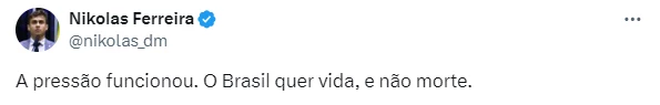 Um dos principais articuladores contra a nota técnica, o deputado federal Nikolas Ferreira (PL-MG), manifestou sua satisfação nas redes sociais. Em sua conta na rede social X, antigo Twitter, o parlamentar declarou: “A pressão funcionou. O Brasil quer vida, e não morte”, celebrando o recuo do governo diante da mobilização da oposição.