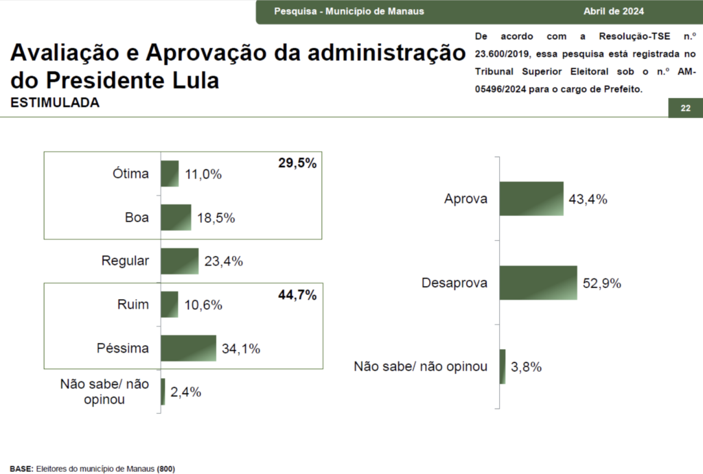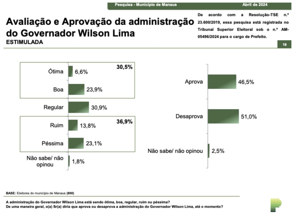 Segundo a pesquisa cadastrada sob o número AM 05496/2024, a avaliação da gestão de Wilson Lima supera a de Lula entre os residentes de Manaus. Na modalidade estimulada, enquanto 46,5% aprovam a administração do governador, 43,4% aprovam a gestão do atual presidente. A desaprovação em relação ao governo federal atinge 52,9%.