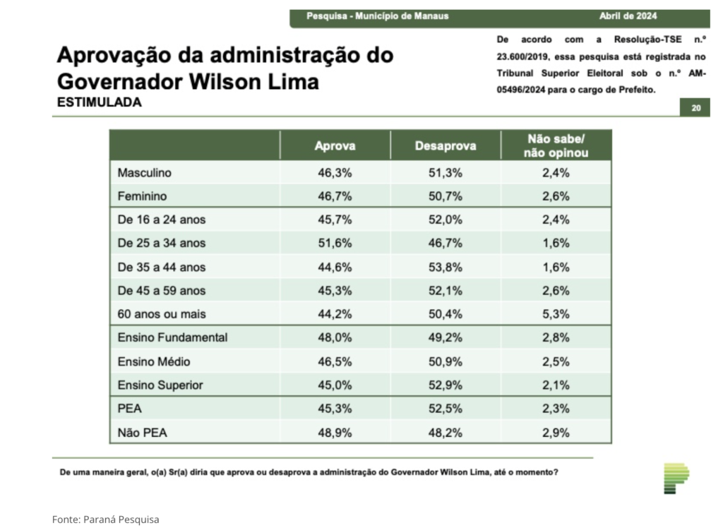A pesquisa, que entrevistou 800 eleitores de 10 a 15 de abril de 2024, também revela nuances demográficas e educacionais. Por exemplo, a aprovação da gestão de Wilson Lima é mais alta entre mulheres, com 46,7% de aprovação, e na faixa etária de 25 a 34 anos.