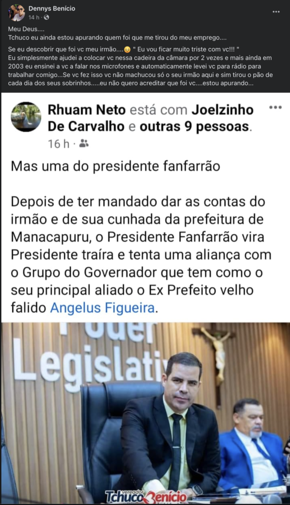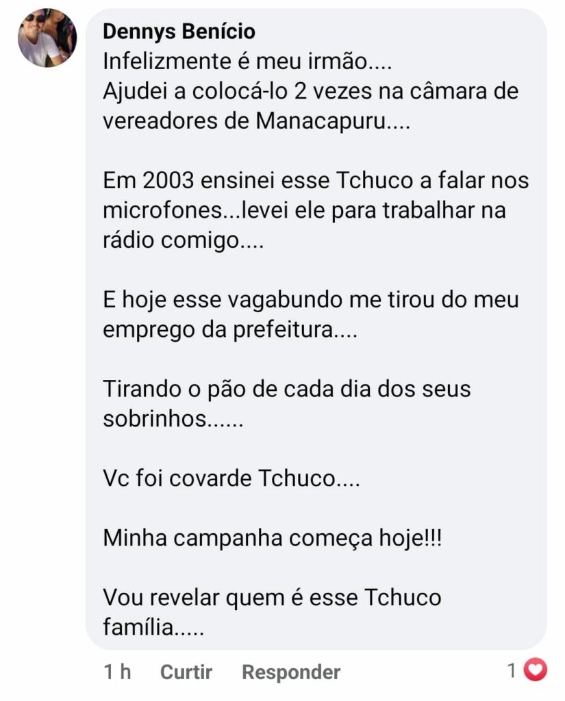 “Infelizmente é meu irmão…. Ajudei a colocá-lo 2 vezes na câmara de vereadores de Manacapuru…. Em 2003 ensinei esse Tchuco a falar nos microfones…levei ele para trabalhar na rádio comigo…. E hoje esse vagabundo me tirou do meu emprego da prefeitura…. Tirando o pão de cada dia dos seus sobrinhos…… Vc foi covarde Tchuco…. Minha campanha começa hoje!!! Vou revelar quem é esse Tchuco família…”, desabafou Dennys Benício.
