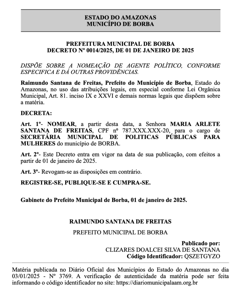 Amazonas – O prefeito de Borba, Raimundo Santana de Freitas, conhecido como Toco Santana (Republicanos), está no centro de uma denúncia de nepotismo após nomear a própria esposa e a irmã para cargos estratégicos dentro da gestão municipal. A revelação gerou forte repercussão entre os moradores da cidade e levanta questionamentos sobre o uso da máquina pública para beneficiar familiares.