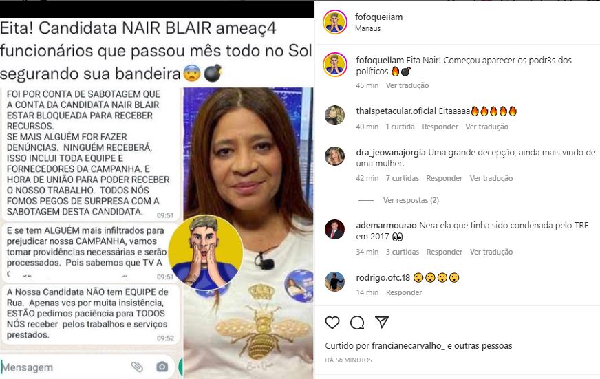 Amazonas – Funcionários da campanha de Nair Blair estão sendo ameaçados pela assessoria da candidata Nair Blair (Agir) após denunciarem calote. Segundo denúncia divulgada neste sábado (1) pelas redes sociais, assessoria da candidata ameaçou não pagar os funcionários que denunciarem o atraso de pagamento.