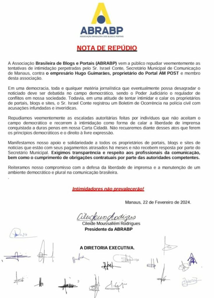 A associação, que reúne mais de 80 portais de notícias no estado do Amazonas, também denuncia que o Secretário Municipal de Comunicação de Manaus “optou por uma postura de intimidação, registrando um Boletim de Ocorrência na polícia civil com acusações infundadas e inverídicas contra Hugo Guimarães” e que tal “atitude é veementemente repudiada pela ABRABP, que enfatiza o compromisso com a defesa da liberdade de imprensa, conquistada com esforço na Carta Cidadã”. Além disso, o associação denuncia o atraso de pagamentos a outros veículos de comunicação, que estão há meses sem resposta do atual secretário Israel Conte.