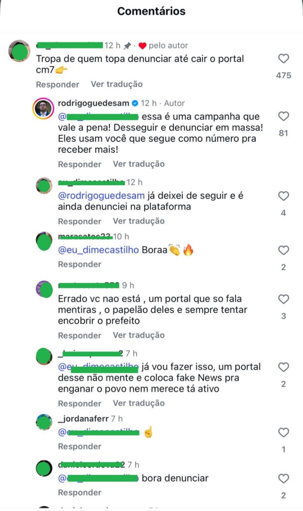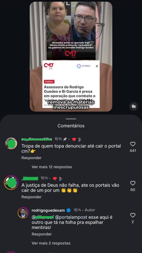 Em um vídeo no qual comenta decisão judicial relacionada à retirada de conteúdo do site, um seguidor escreveu: “Tropa de quem topa denunciar até cair o portal CM7”. A publicação recebeu 482 curtidas — entre elas, a do próprio vereador.