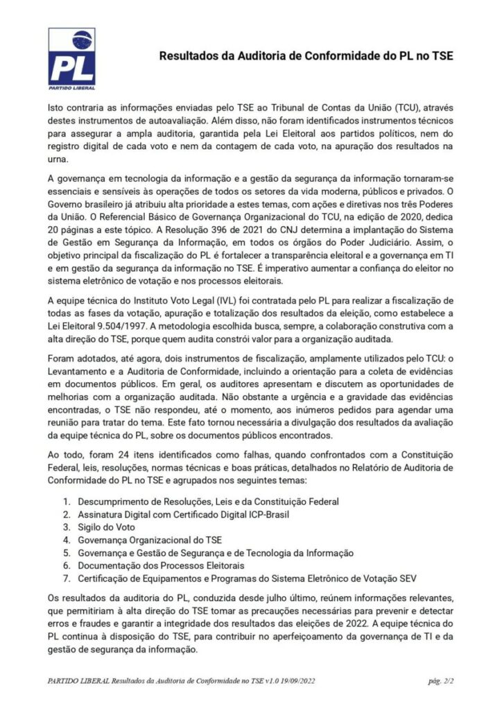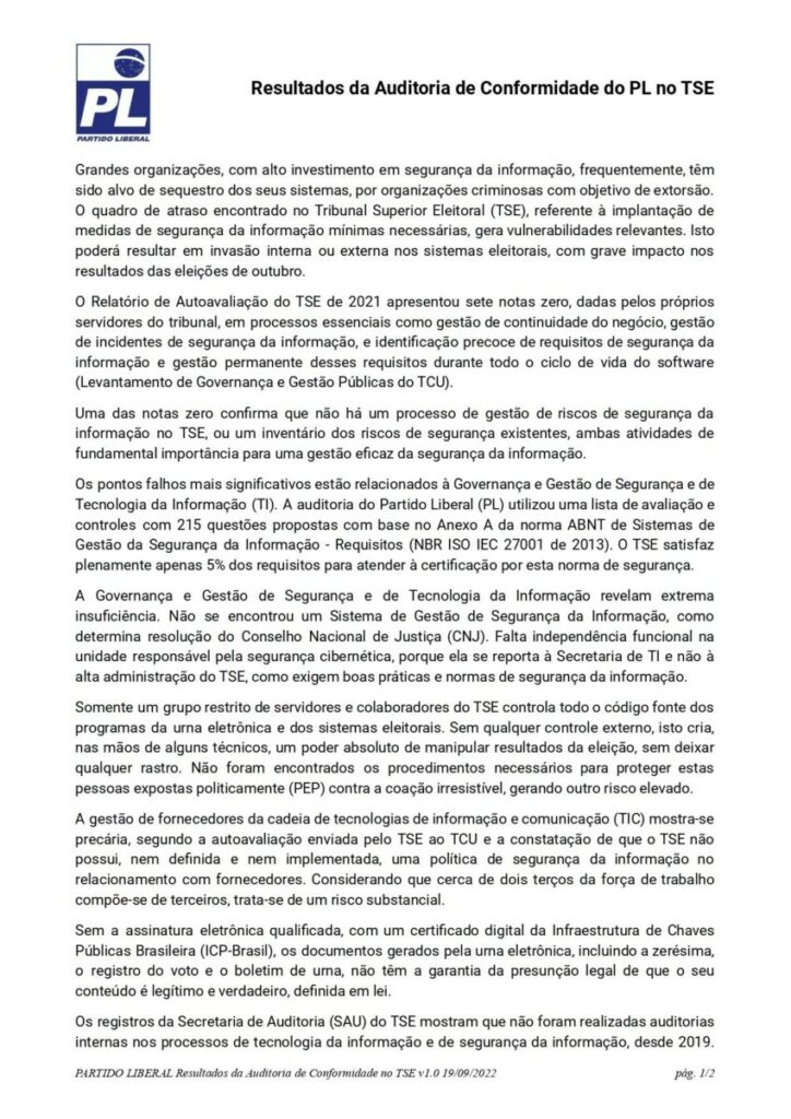 “A auditoria do Partido Liberal (PL) utilizou uma lista de avaliação e controles com 215 questões propostas com base no Anexo A da norma ABNT de Sistemas de Gestão da Segurança da Informação – Requisitos (NBR ISO IEC 27001 de 2013). O TSE satisfaz plenamente apenas 5% dos requisitos para atender à certificação por esta norma de segurança”, diz a conclusão da auditoria.