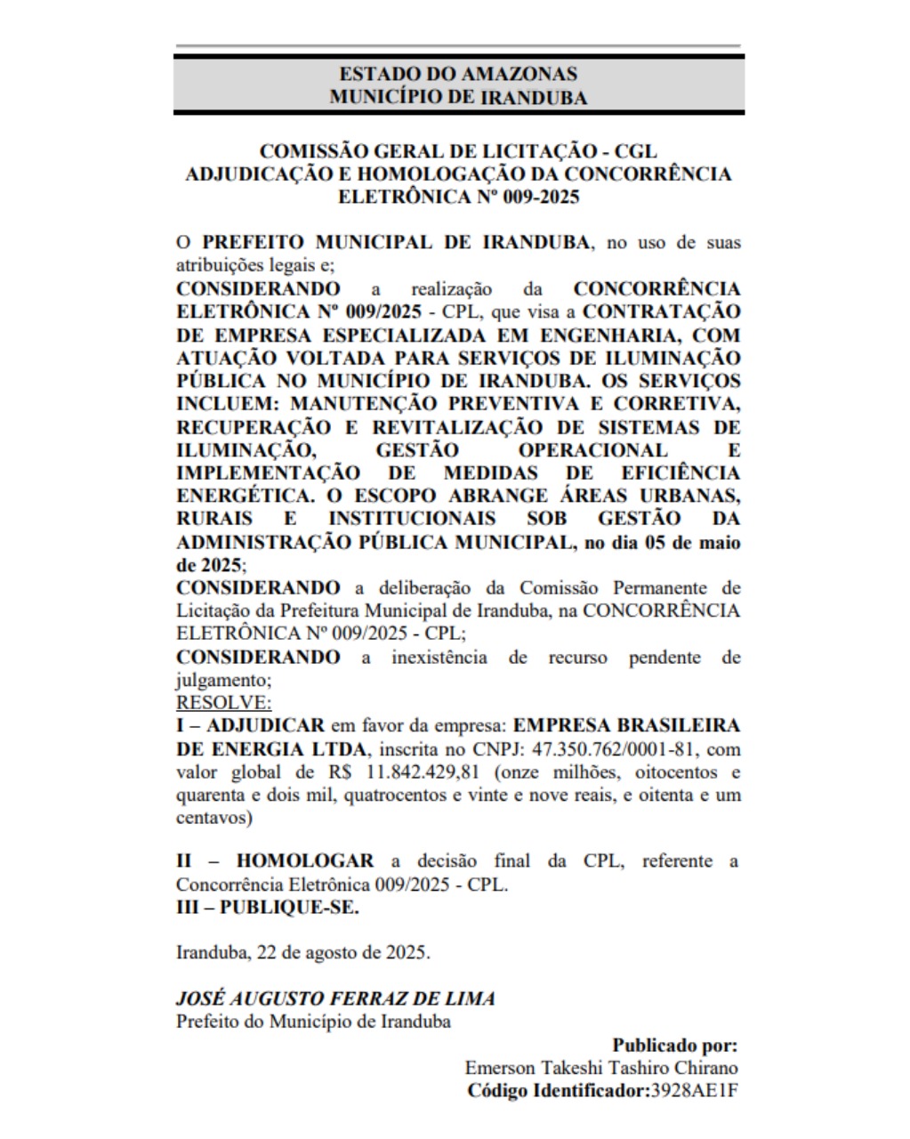 Amazonas – O prefeito de Iranduba, Augusto Ferraz (UB), autorizou um contrato no valor de R$ 11,8 milhões com a Empresa Brasileira de Energia LTDA para serviços de iluminação pública no município. O gasto chama atenção porque, em março deste ano, a própria Secretaria de Estado de Desenvolvimento Urbano e Metropolitano (Sedurb), por meio da Unidade Gestora de Projetos Especiais (UGPE), anunciou a modernização da rede de iluminação de Iranduba com o programa Ilumina+ Amazonas, no qual foram aplicados R$ 9 milhões.