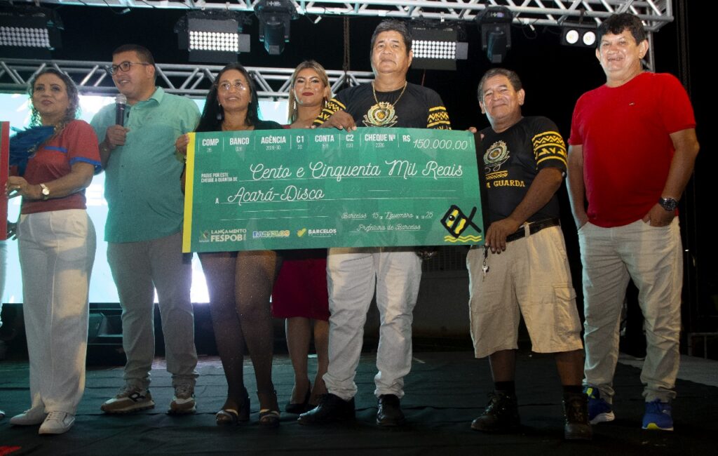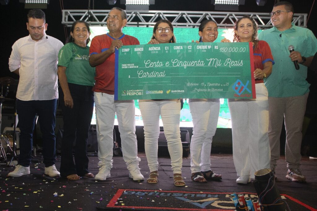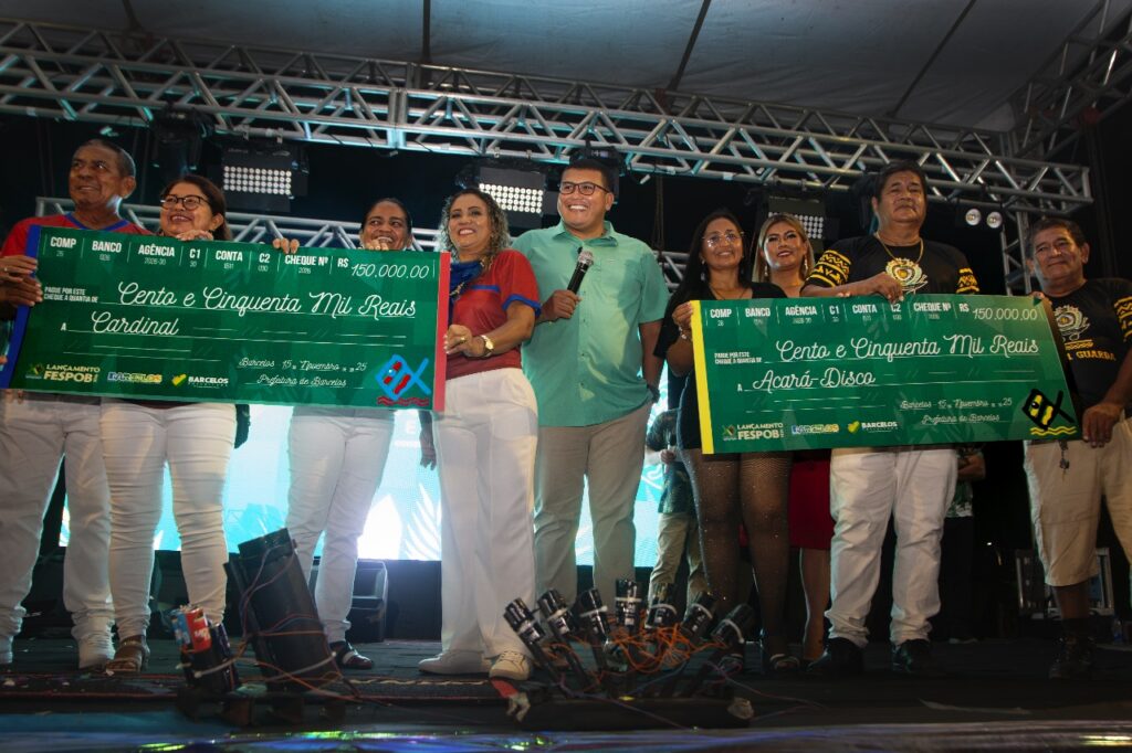 Em outro momento muito aguardado da noite, o prefeito realizou a entrega da primeira parcela do investimento da Prefeitura às agremiações Acará-Disco e Cardinal. O repasse reforça o compromisso da gestão com o fortalecimento da cultura local, garantindo mais estrutura, qualidade e organização às apresentações dos grupos, que são pilares da festa e também importantes geradores de postos de trabalho e renda.