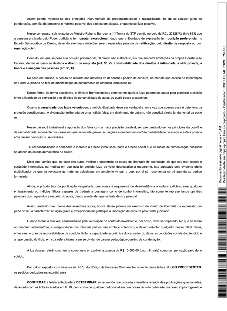 A juíza não teve dúvidas: houve abuso da liberdade de expressão, com veiculação de informações falsas e juízo depreciativo à imagem de Cileide. As reportagens, segundo a decisão, ultrapassaram o dever de informar e escancararam um ataque pessoal, sem qualquer embasamento jurídico.