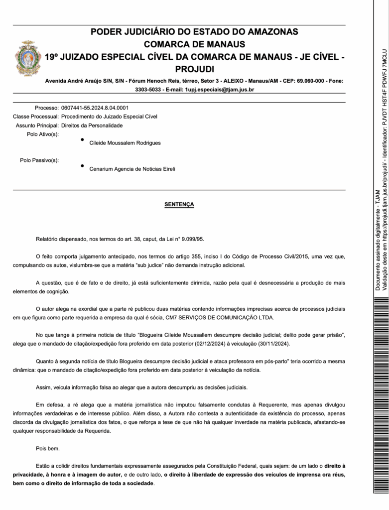 Manaus – A máscara caiu! A Justiça do Amazonas deu ganho de causa à empresária e líder social Cileide Moussallem em um processo bombástico contra a revista Cenarium. A sentença, assinada pela juíza Sheilla Jordana de Sales, reconheceu que a agência de notícias mentiu deliberadamente ao publicar duas matérias acusando Cileide de descumprir ordens judiciais – antes mesmo dessas decisões existirem oficialmente.