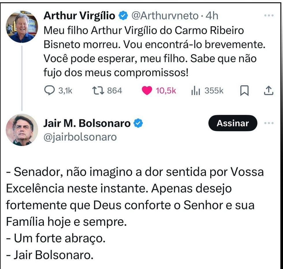 Entre as muitas homenagens, o ex-presidente Jair Bolsonaro comentou em uma publicação do pai de Bisneto, Arthur Virgílio Neto, ex-senador e ex-prefeito de Manaus, expressando suas condolências: