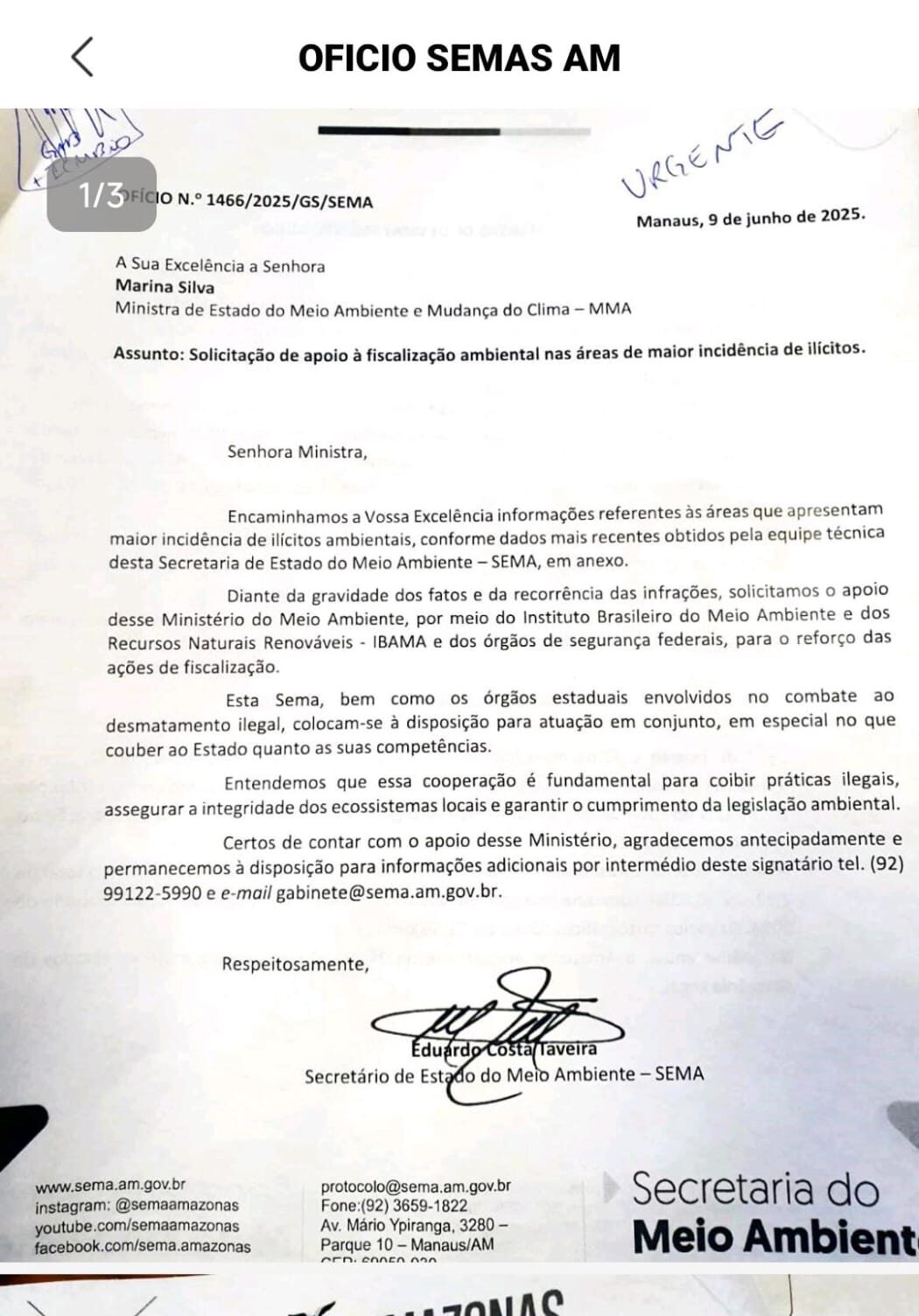 A confissão veio após questionamentos sobre a operação que devastou a zona rural do município, especialmente na região do Distrito de Sucunduri. O caso teve início com um ofício “URGENTE”, datado de 9 de junho de 2025, assinado pelo secretário de Meio Ambiente do Amazonas, Eduardo Taveira, e enviado ao Ministério de Marina Silva. O documento solicitava reforço federal para fiscalizações em áreas de suposto desmatamento ilegal, desencadeando uma ação conjunta do IBAMA e forças federais.
