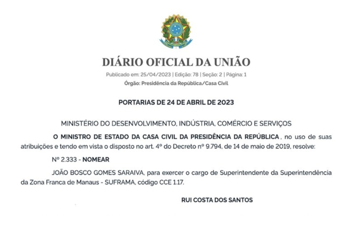 Manaus – O ex-deputado federal Bosco Saraiva foi oficialmente nomeado como o novo superintendente da Zona Franca de Manaus (Suframa), nesta terça-feira (25), após ser convidado no início de abril pelo vice-presidente da República, Geraldo Alckmin.