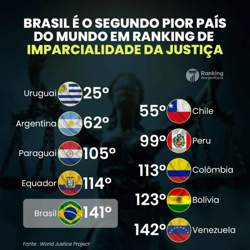 Brasil – O Brasil alcançou a preocupante 80ª posição no Rule of Law Index (Índice do Estado de Direito) de 2024, elaborado pela World Justice Project (WJP), com uma pontuação de 0,50. O levantamento, que analisou 142 países, coloca o sistema judiciário brasileiro em destaque negativo, especialmente na categoria de Justiça Criminal, onde o país ficou em 113º lugar, com nota de 0,33 – bem abaixo da média global de 0,47. No quesito imparcialidade do Judiciário, o Brasil só supera a Venezuela, evidenciando graves desafios na isenção do sistema judicial.