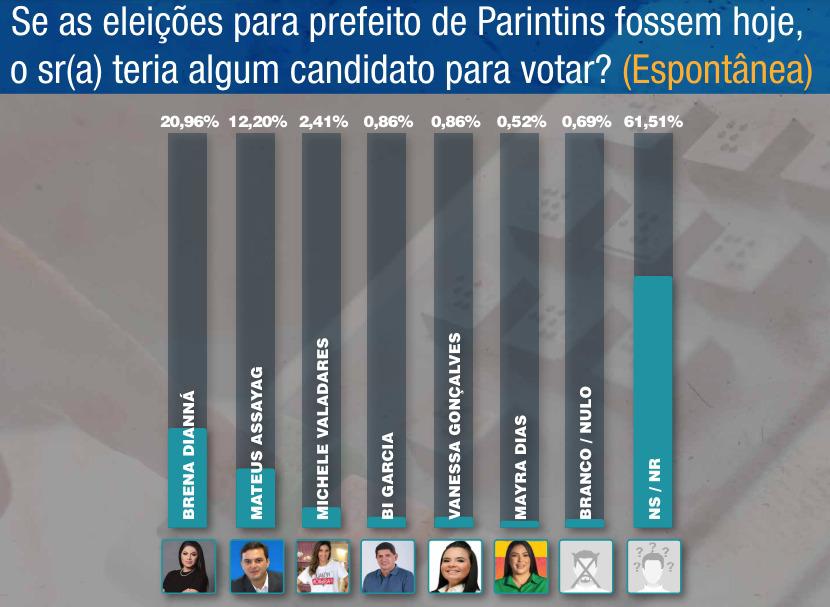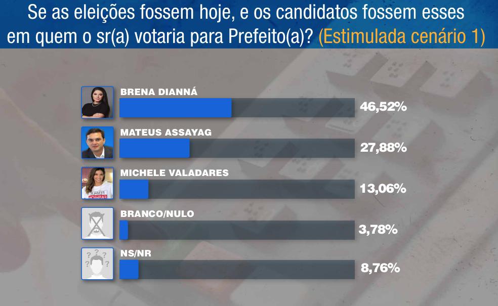 Ela é seguida por Mateus Assayag, que aparece com 27,88% das intenções de voto, e Michele Valadares, com 13,06%. A pesquisa foi realizada no mês de junho, com uma amostra de 582 entrevistados, apresentando uma margem de erro de 4,05% e um nível de confiança de 95%.