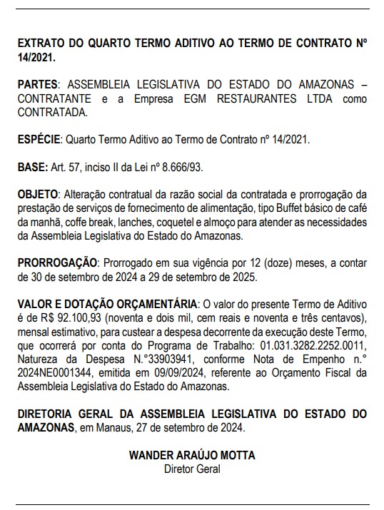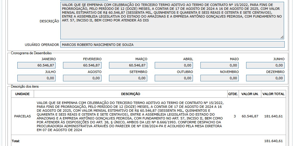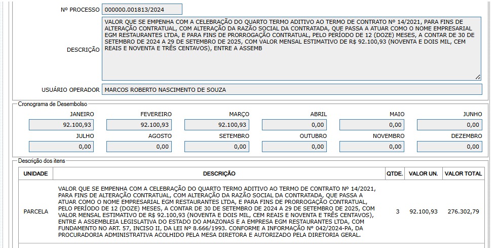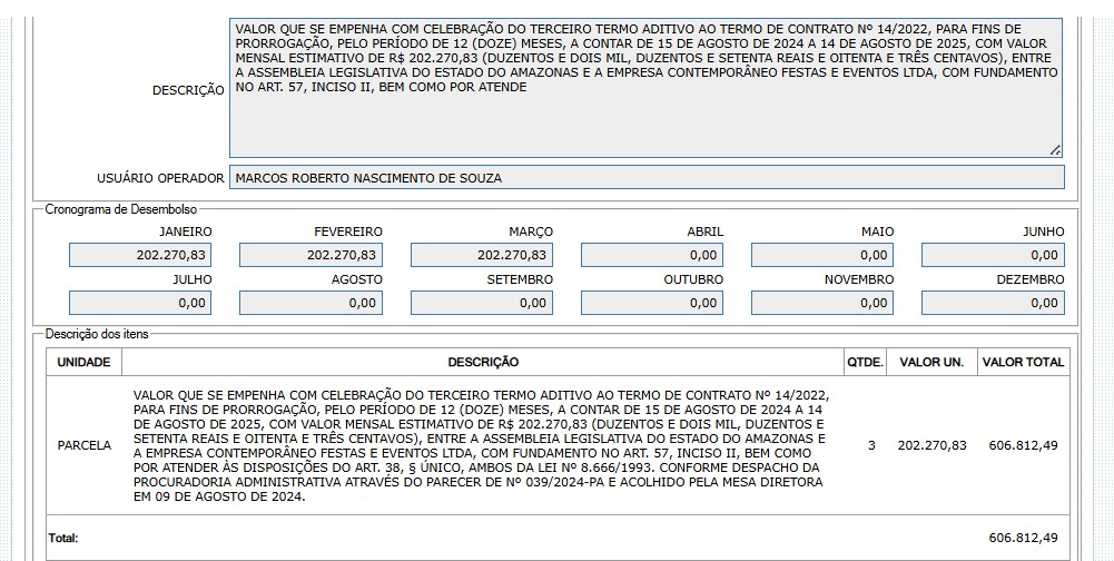 Com a prorrogação dos contratos, os gastos devem crescer ainda mais. Nos próximos 12 meses, a EGM Restaurantes poderá receber R$ 1.105.211,16, enquanto Antonio Gonçalves Pedrosa – ME terá direito a R$ 726.562,44. Já a Contemporâneo Festas, que lidera em valores, está projetada para embolsar R$ 2.427.249,96. Somados, esses montantes chegam a R$ 4.259.023,56, uma quantia expressiva destinada exclusivamente a serviços de alimentação em eventos institucionais.