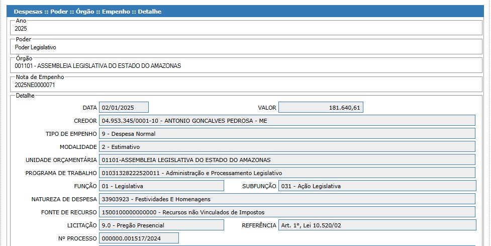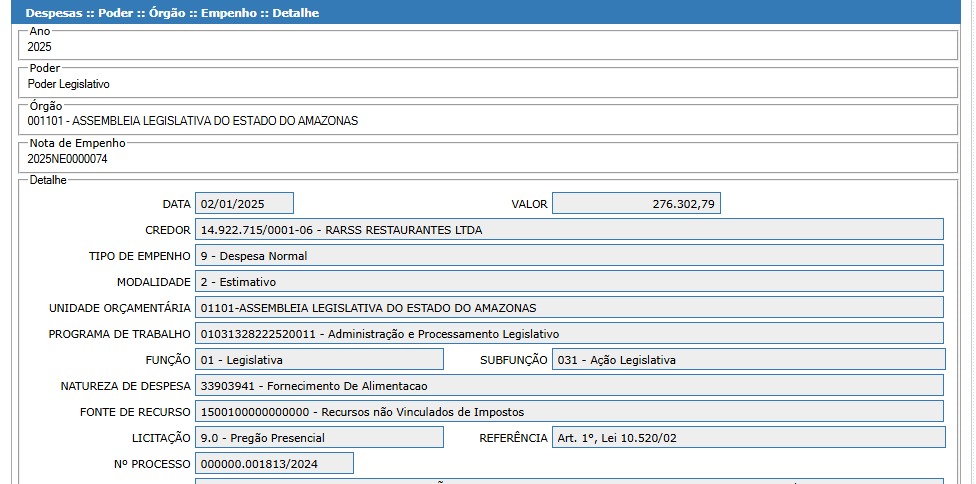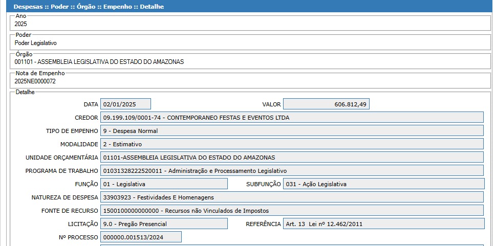 Três empresas foram contratadas para atender a essa demanda: Contemporâneo Festas e Eventos LTDA, EGM Restaurantes LTDA e Antonio Gonçalves Pedrosa – ME. Os contratos, que já vigoravam, foram renovados por mais um ano, com aditivos que ampliam os valores a serem pagos. Até março de 2025, as cifras já impressionam: a Contemporâneo Festas recebeu R$ 606.812,49, a EGM Restaurantes faturou R$ 276.302,79 e Antonio Gonçalves Pedrosa – ME levou R$ 181.640,61. Juntas, essas empresas já consumiram R$ 1.064.755,89 em apenas três meses, valor referente a serviços prestados em solenidades e atividades internas da Aleam.