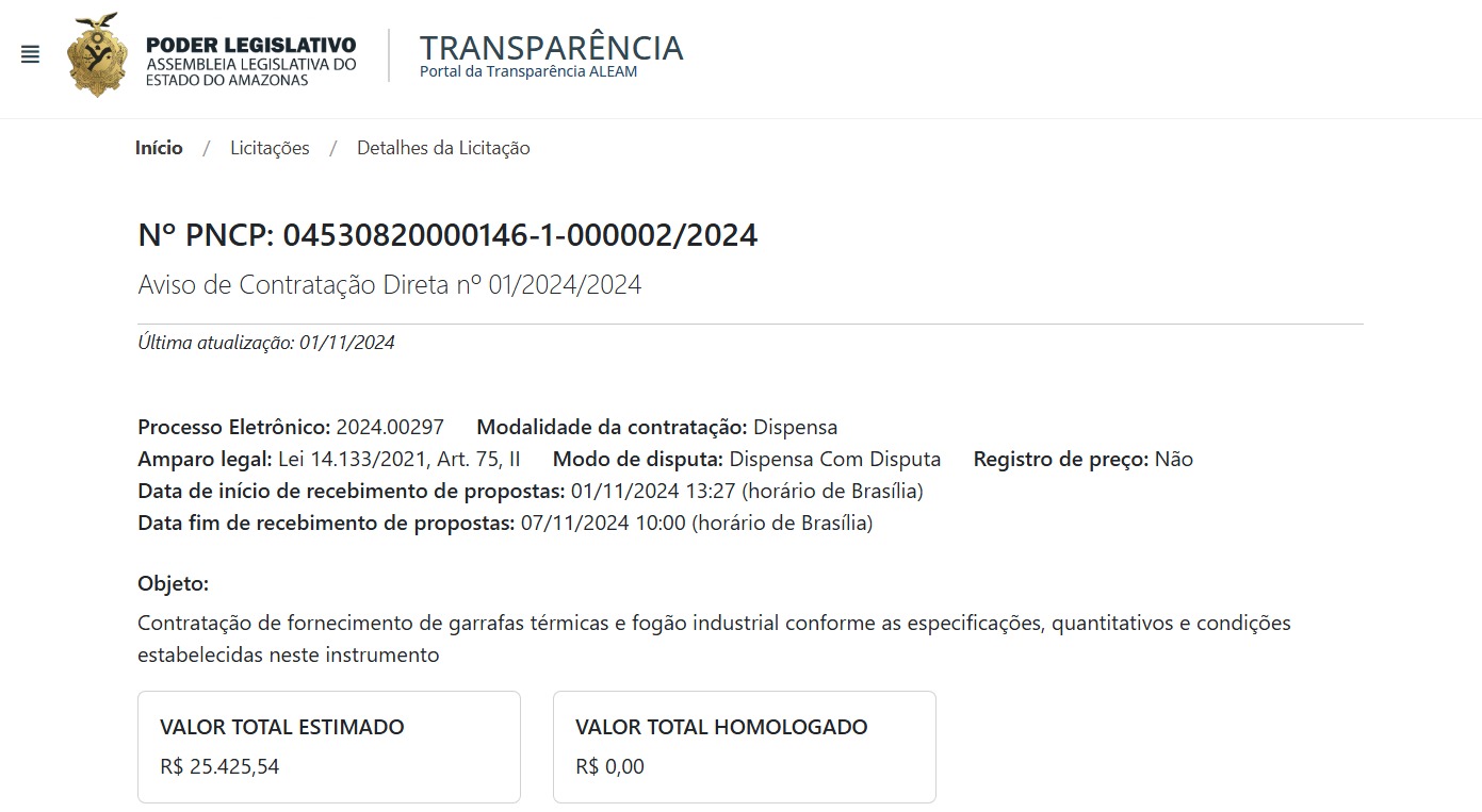 Os processos, registrados sob a DISPENSA DE LICITAÇÃO ELETRÔNICA N°01/2024, estão em tramitação desde novembro de 2024. Segundo os dados da própria transparência da Aleam, as propostas começaram a ser recebidas em 1º de novembro e se encerraram no dia 7 do mesmo mês. O que não fica claro, porém, é em que pé anda esse processo ou quais empresas terão a honra de equipar a cozinha legislativa – informações que, aparentemente, não merecem tanto destaque quanto o café quentinho que está por vir.