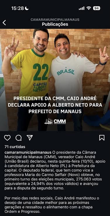 Manaus – O presidente da Câmara Municipal de Manaus, vereador Caio André (União Brasil), está sendo investigado após utilizar as redes sociais oficiais da Casa Legislativa para fazer campanha em apoio à candidatura de Alberto Neto (PL) à prefeitura de Manaus. A publicação, feita durante o período eleitoral, foi removida cerca de 30 minutos depois, mas o episódio gerou forte repercussão e levantou questionamentos sobre a legalidade da ação.