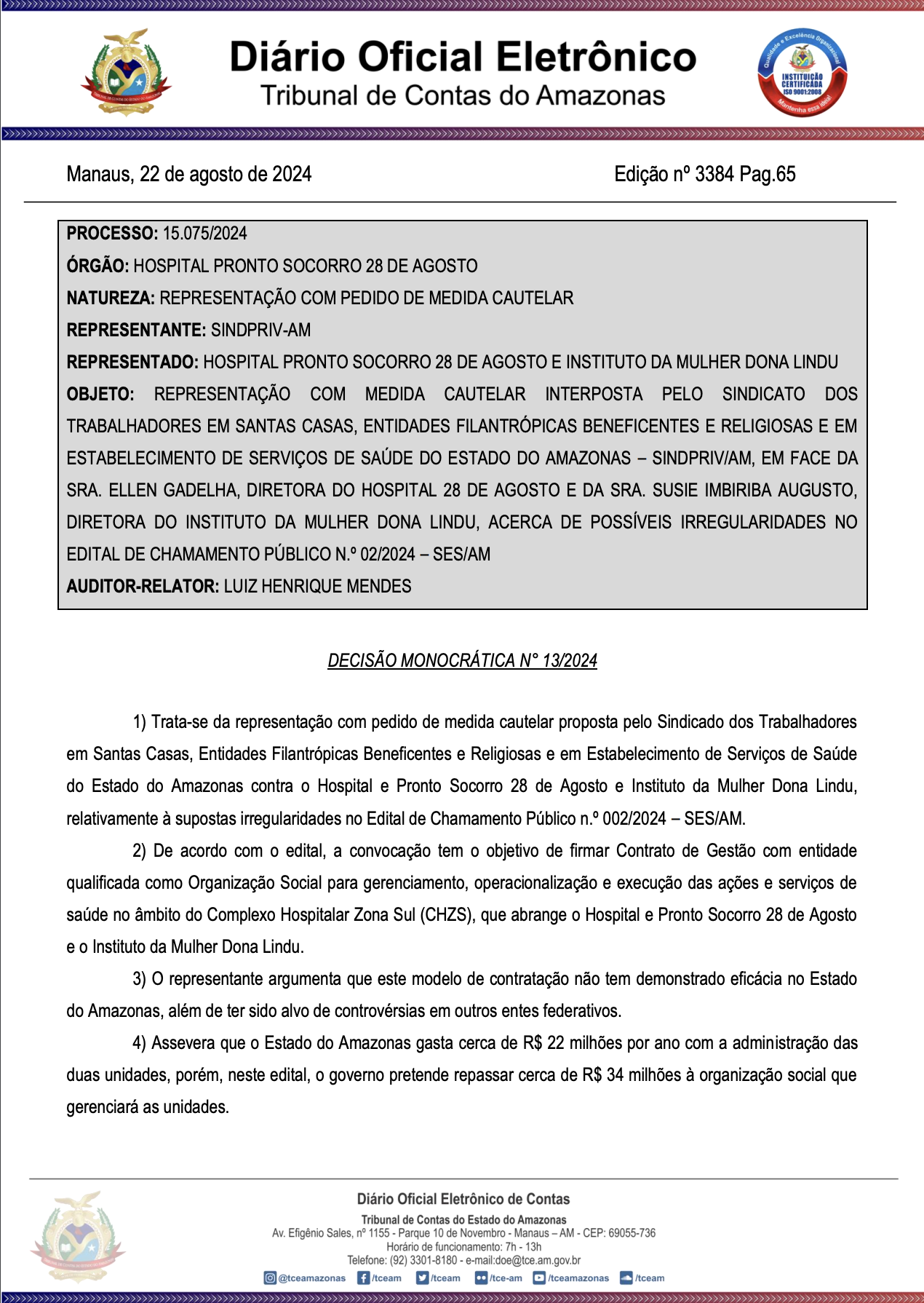 Amazonas – O Tribunal de Contas do Estado do Amazonas (TCE-AM) suspendeu, em decisão monocrática, a convocação pública de nº CP001/2024, que seria realizada pela Secretaria de Estado de Saúde do Amazonas (SES/AM) e poderia custar mais de R$2 bilhões aos cofres públicos. A medida cautelar foi deferida pelo relator Luiz Henrique Mendes, em resposta a uma representação do Sindicato dos Trabalhadores em Santas Casas, Entidades Filantrópicas Beneficentes e Religiosas e em Estabelecimentos de Serviços de Saúde do Estado do Amazonas (SINDPRIV/AM).